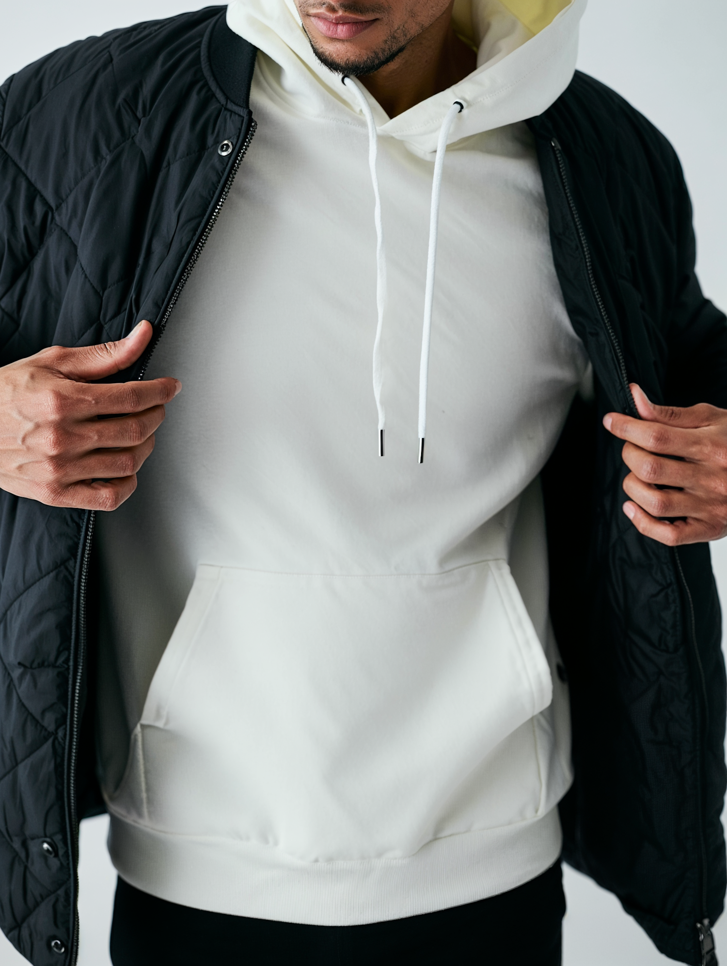Stylish layering with a white hoodie and black quilted jacket. Perfect casual outfit inspiration for cooler weather.