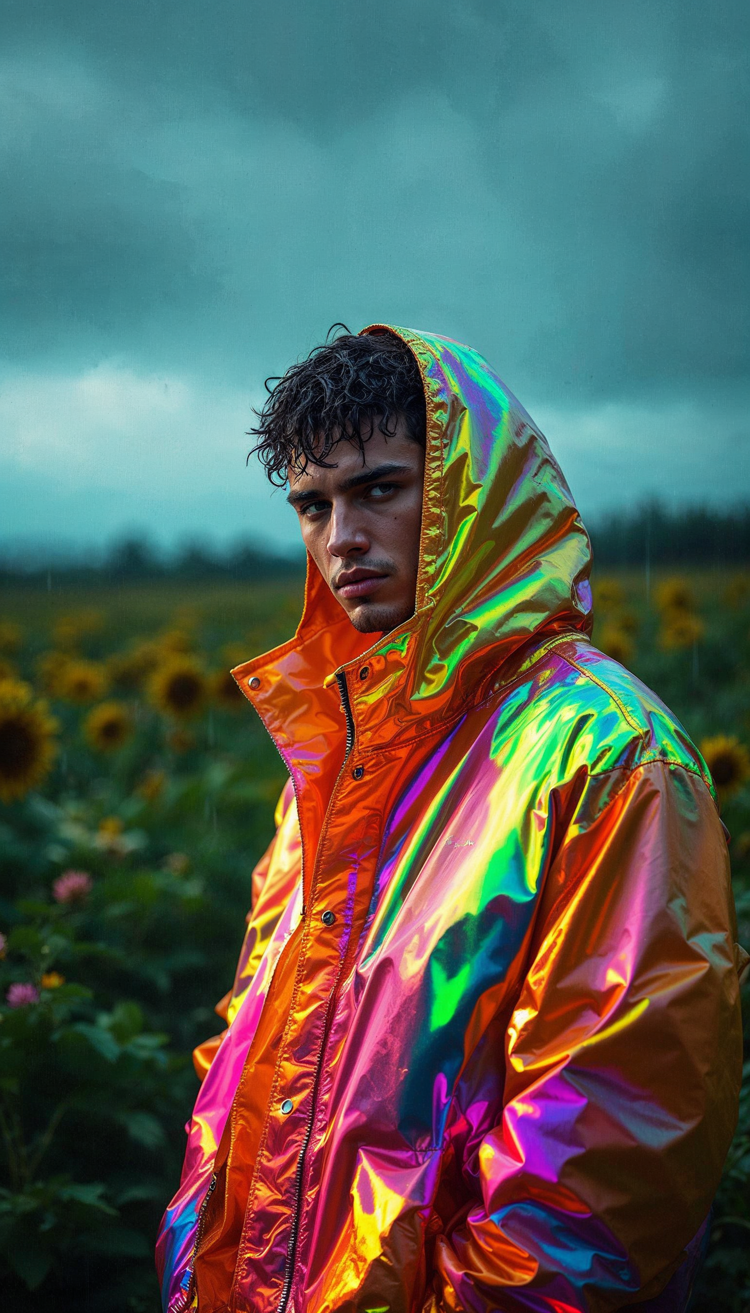 Young man in iridescent jacket stands in sunflower field under moody sky, creating a vibrant contrast with the dark background.
