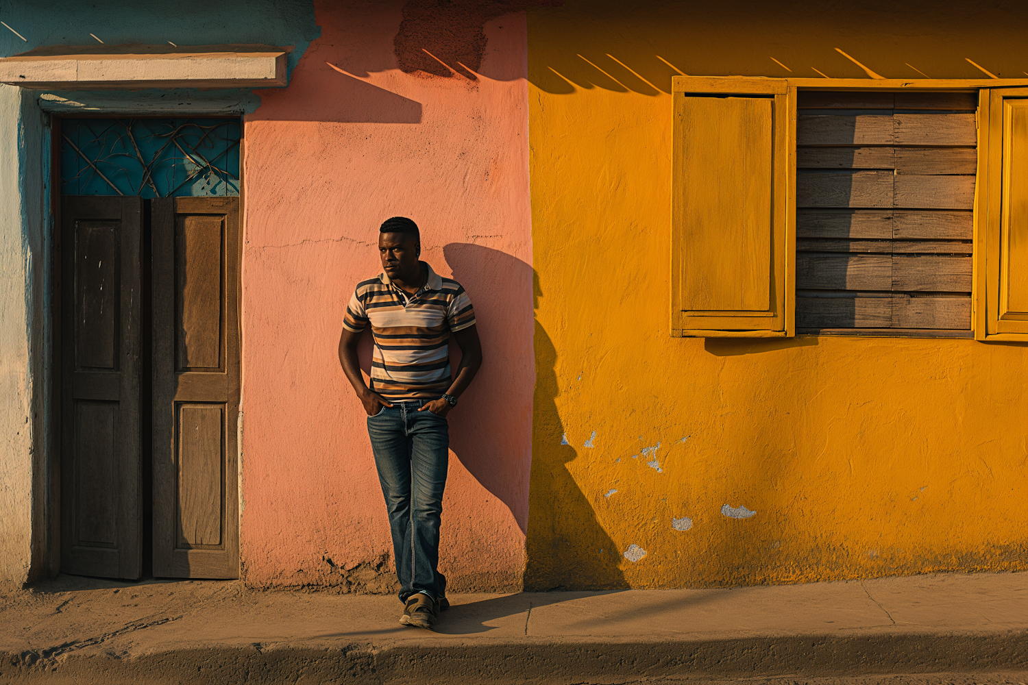 Man in striped shirt leans against colorful wall, casting shadow in warm sunlight. Vibrant pink and yellow hues create a striking contrast.
