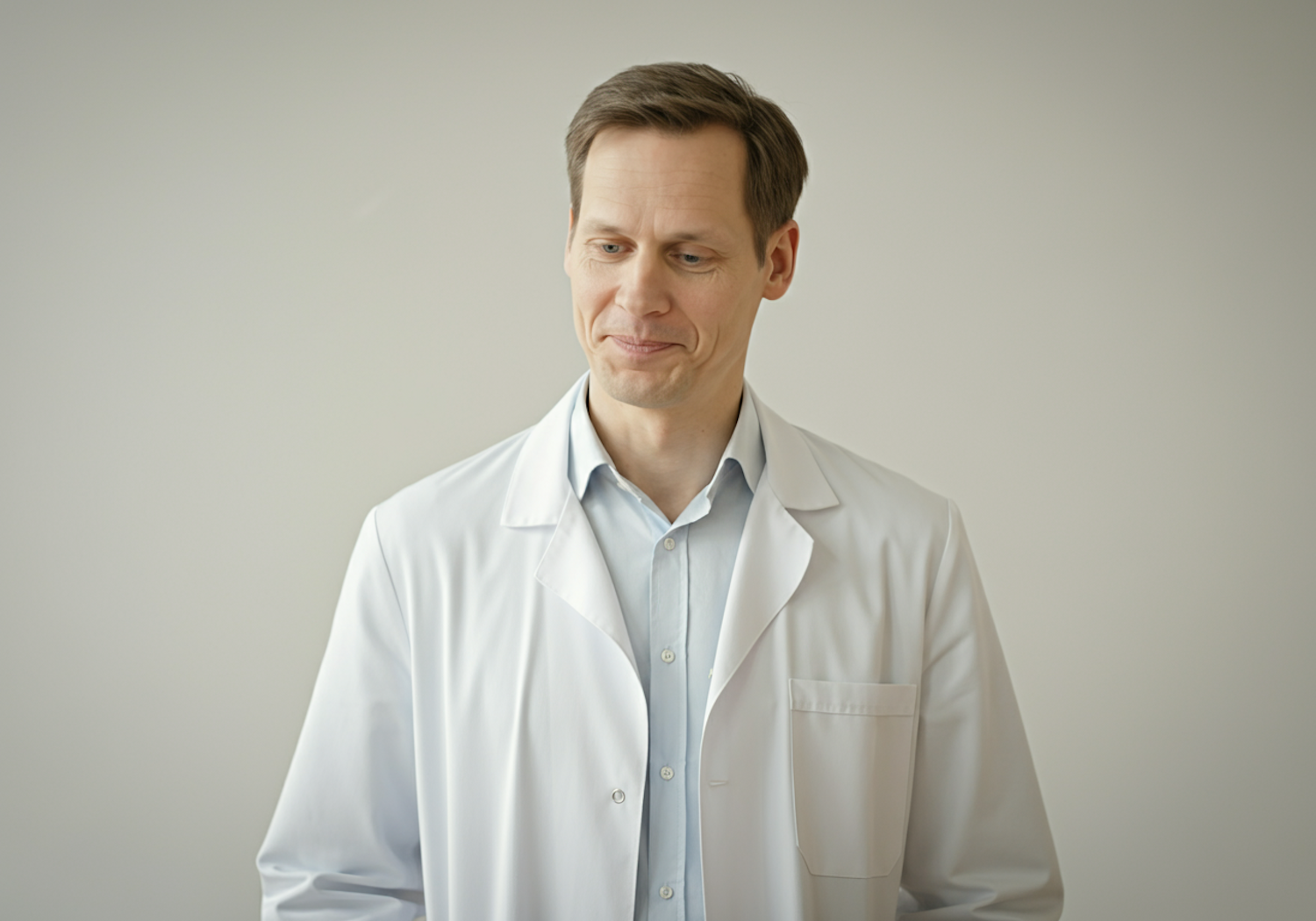 A man in a white lab coat and light blue shirt, looking down with a slight smile, set against a plain light background.