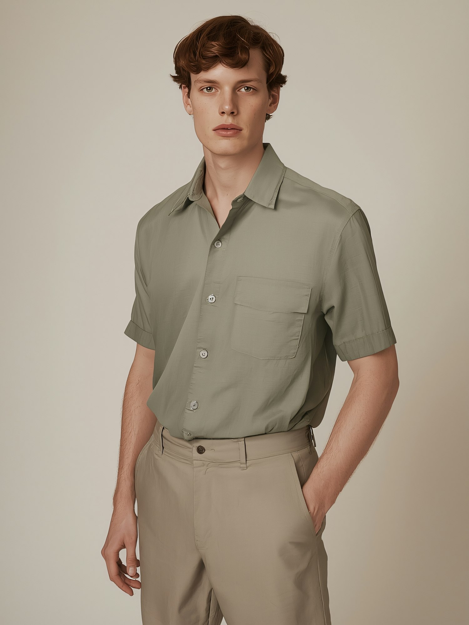 Man in a light green short-sleeve shirt and beige trousers, standing against a neutral background with a calm expression.
