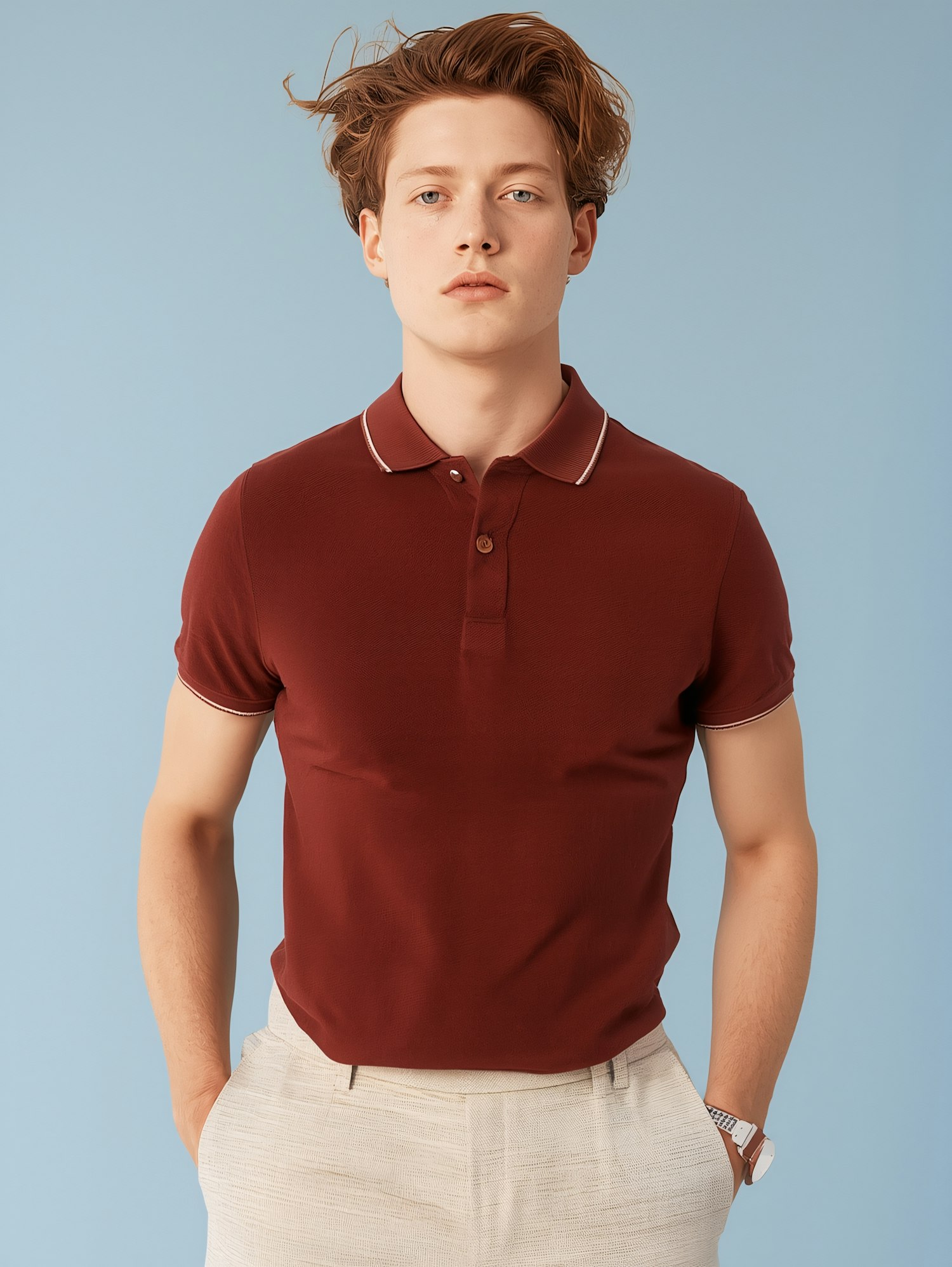 Young man in a maroon polo shirt and beige trousers, standing against a light blue background with a casual and stylish look.