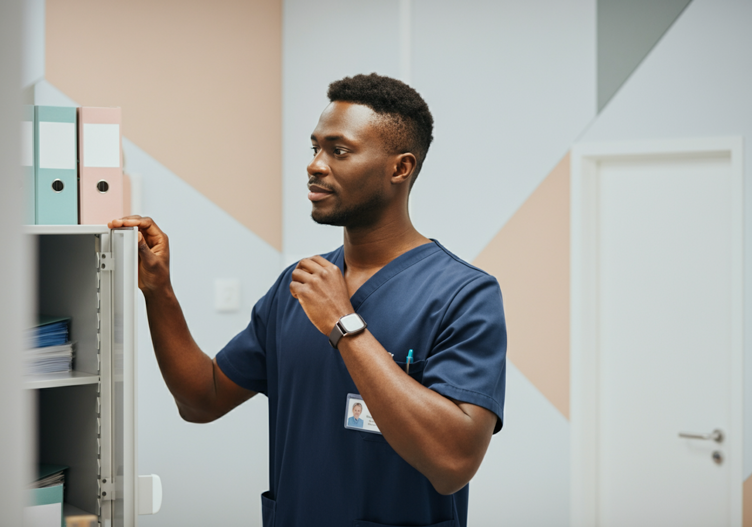A healthcare professional in navy scrubs stands by a cabinet in a modern, pastel-colored room, wearing a smartwatch and ID badge.