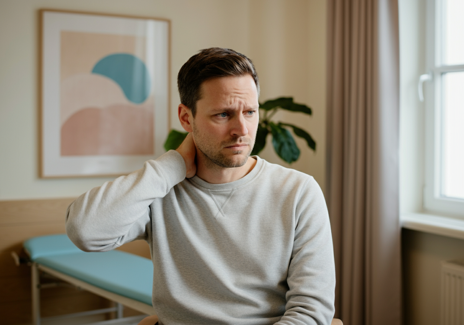 Man in a light gray sweatshirt holding his neck, looking concerned, in a softly lit room with a treatment table and abstract artwork.