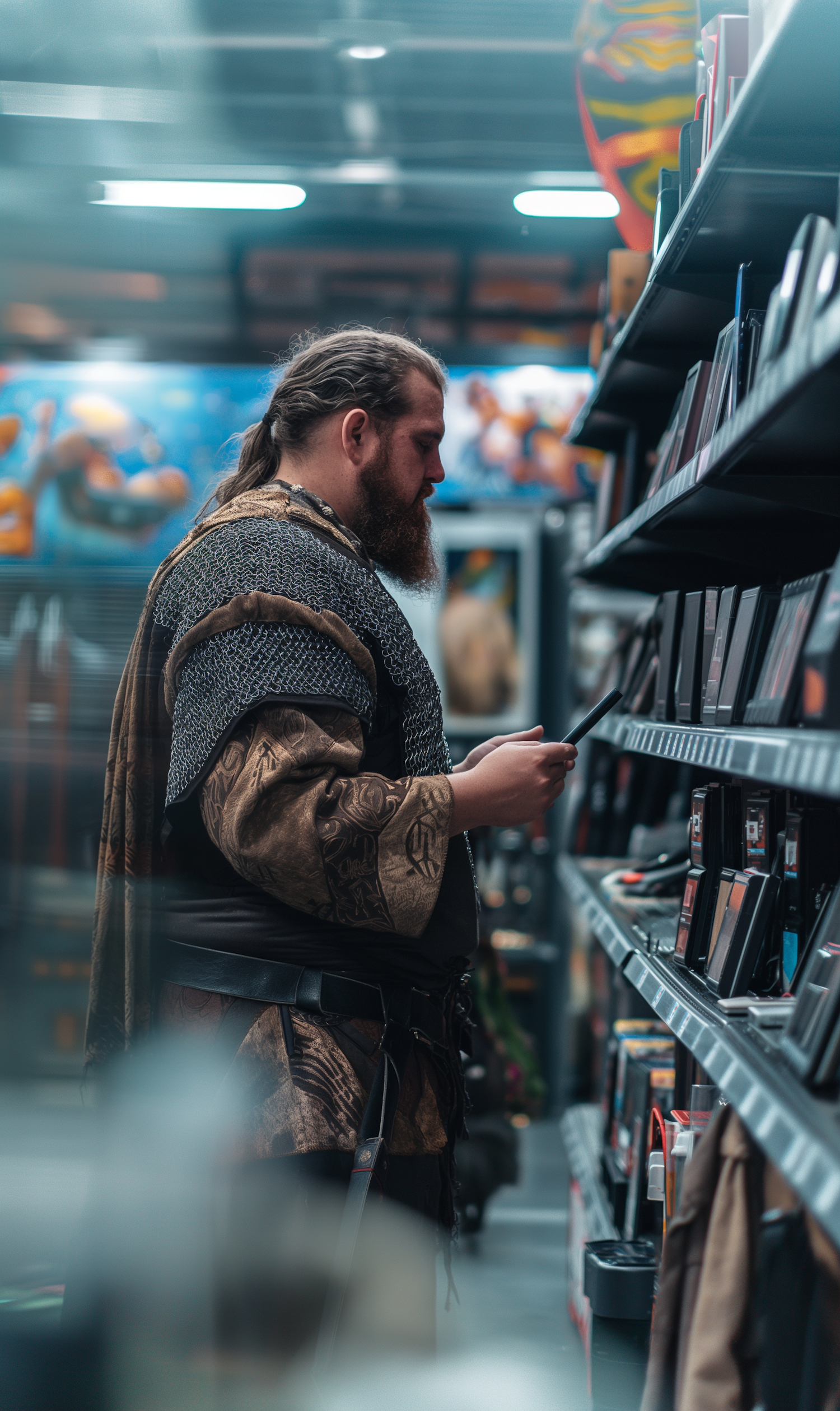 A man in Viking-inspired medieval attire browses a modern store shelf, blending historical and contemporary elements.
