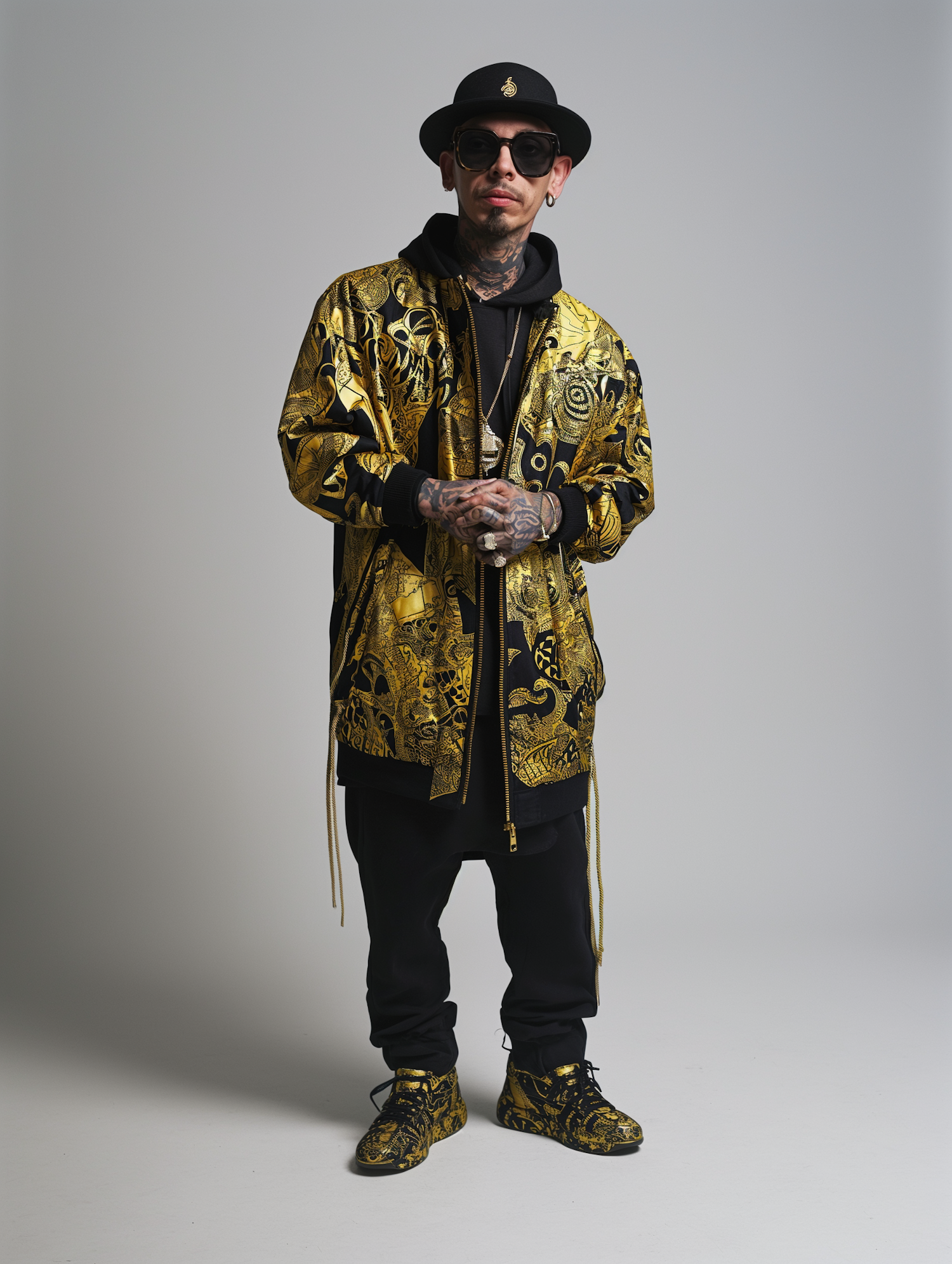 Stylish man in black and gold patterned outfit with tattoos, sunglasses, and hat, exuding confidence and modern fashion flair.
