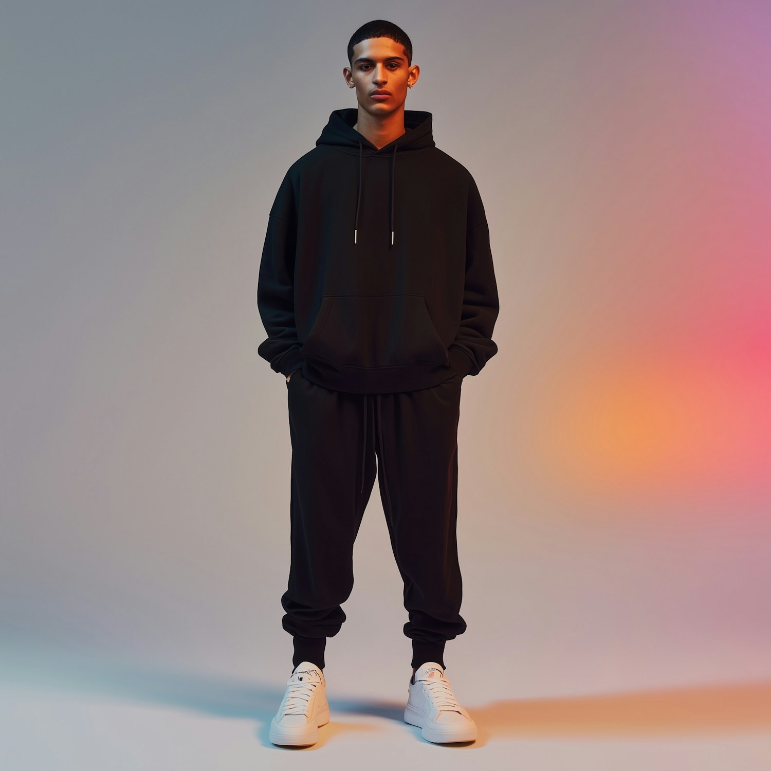 Stylish young man in a black hoodie and joggers with white sneakers, standing against a warm gradient background.