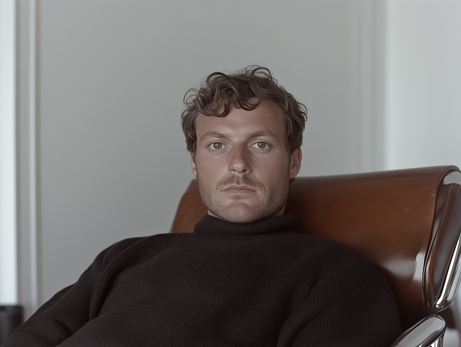 Man with wavy brown hair and black turtleneck sitting in a modern leather chair, gazing directly at the camera in a minimalist setting.