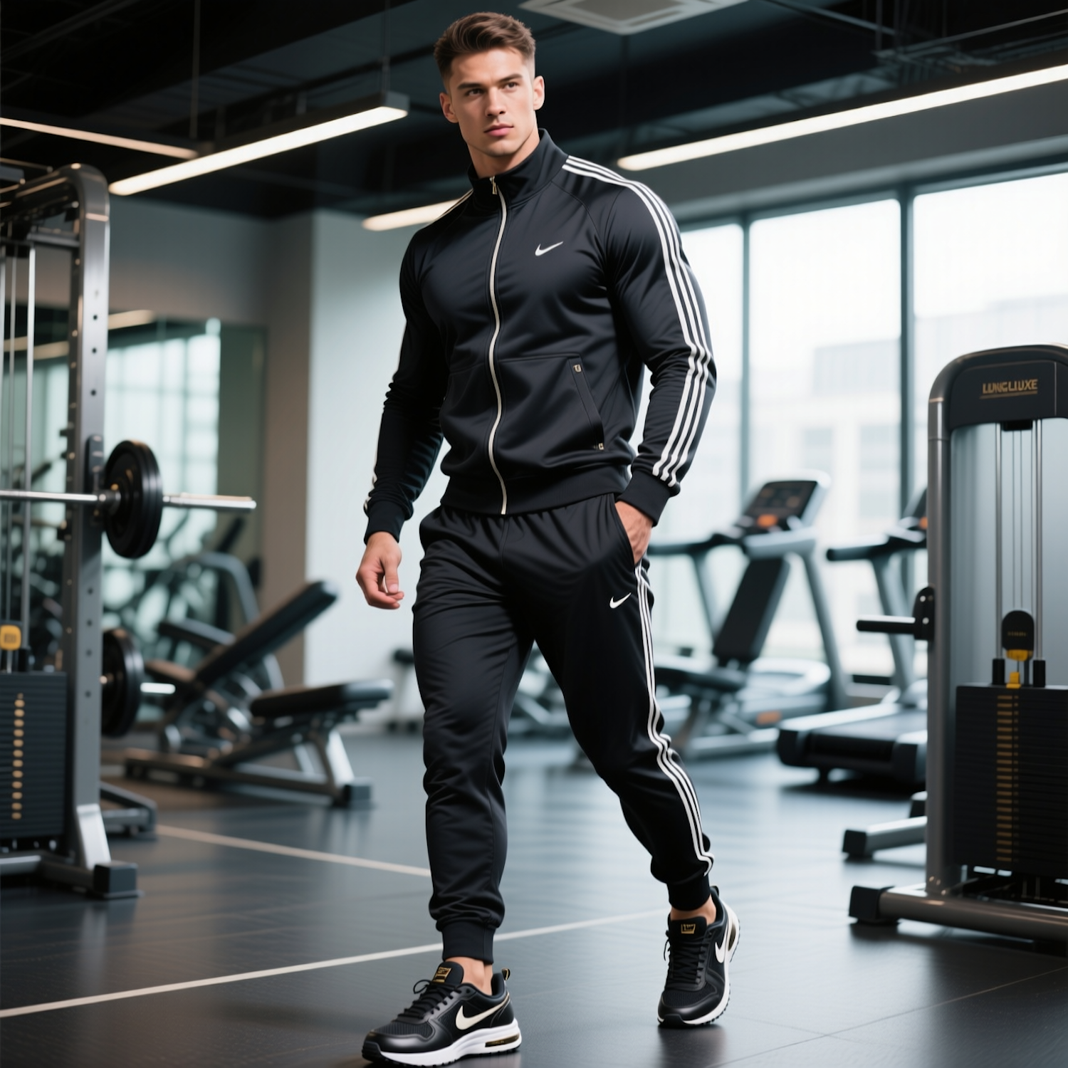 Man in a black tracksuit walking in a modern gym with exercise equipment and natural lighting, showcasing a fitness-focused environment.