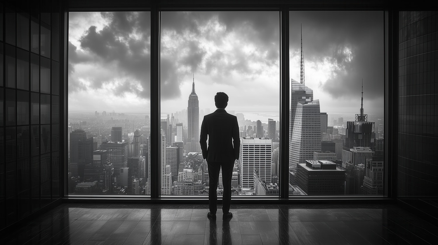 Silhouetted man in a suit gazes at a dramatic black-and-white cityscape through large windows, featuring iconic skyscrapers.