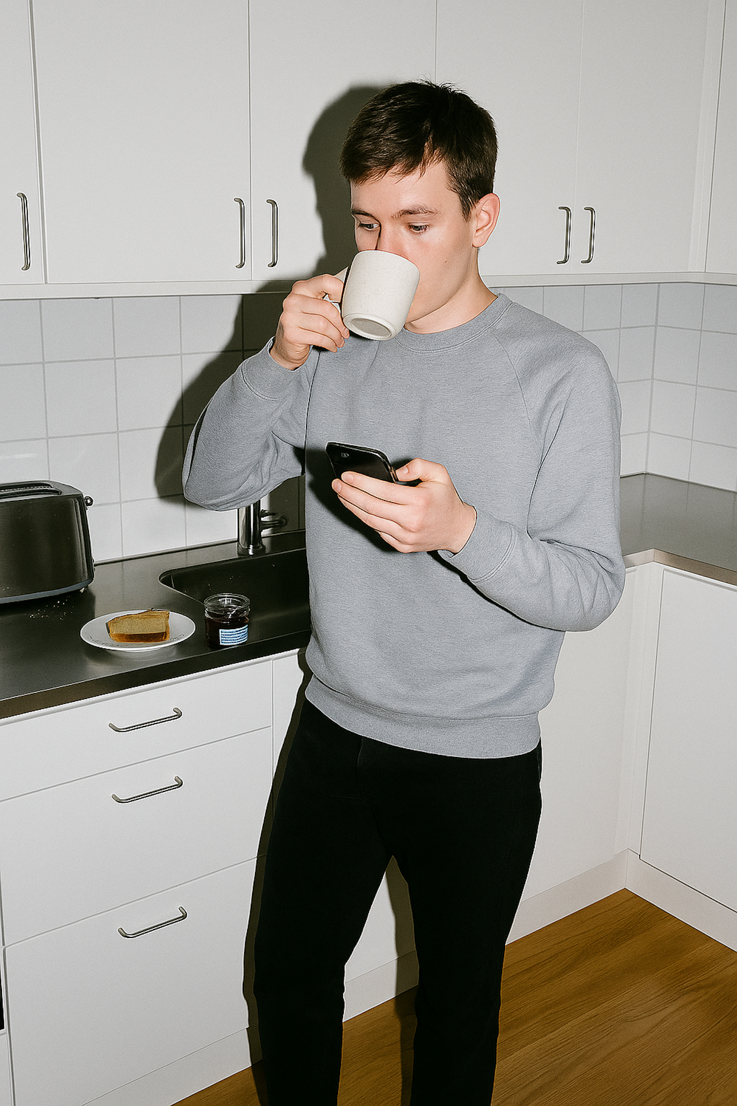 Man in a modern kitchen sipping coffee while checking his phone, with toast and jam on the counter. Casual morning vibes.