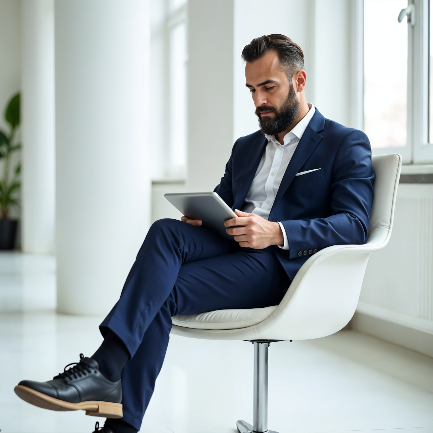 Man in a navy suit sitting in a modern chair, reading a tablet in a bright office with large windows and minimalist decor.