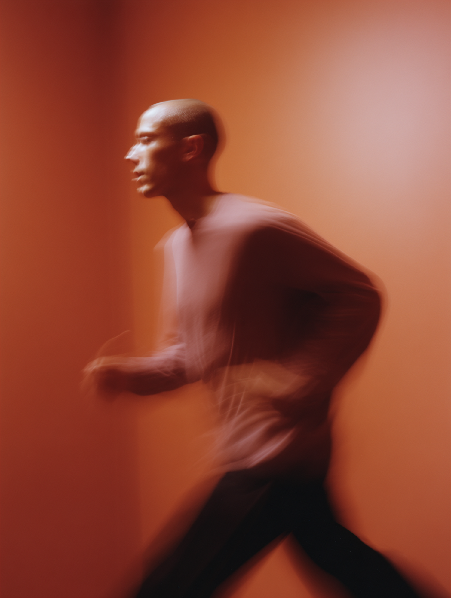 Blurred motion shot of a man running against a warm orange background, creating a dynamic and abstract visual effect.