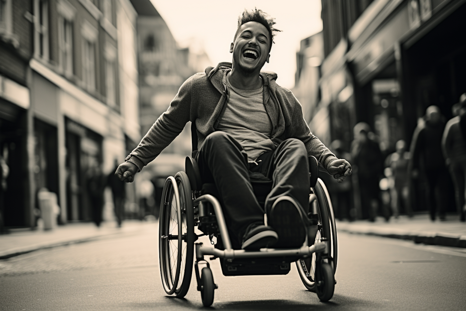 Joyful young man in a wheelchair rolling down a city street, expressing freedom and happiness in a lively urban setting.