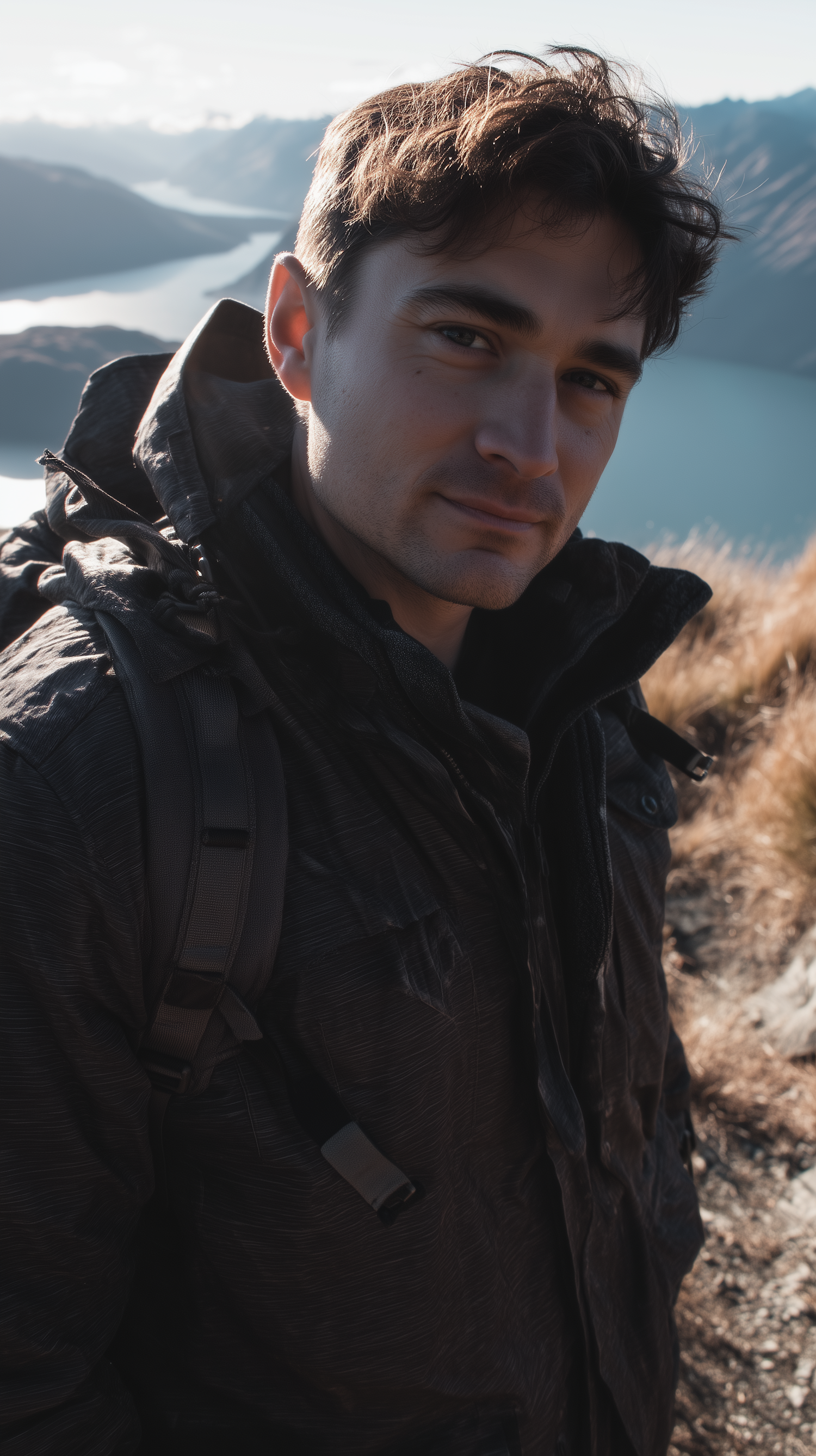 Young man in a dark jacket with a backpack, standing in front of a scenic mountain lake view under soft natural light.