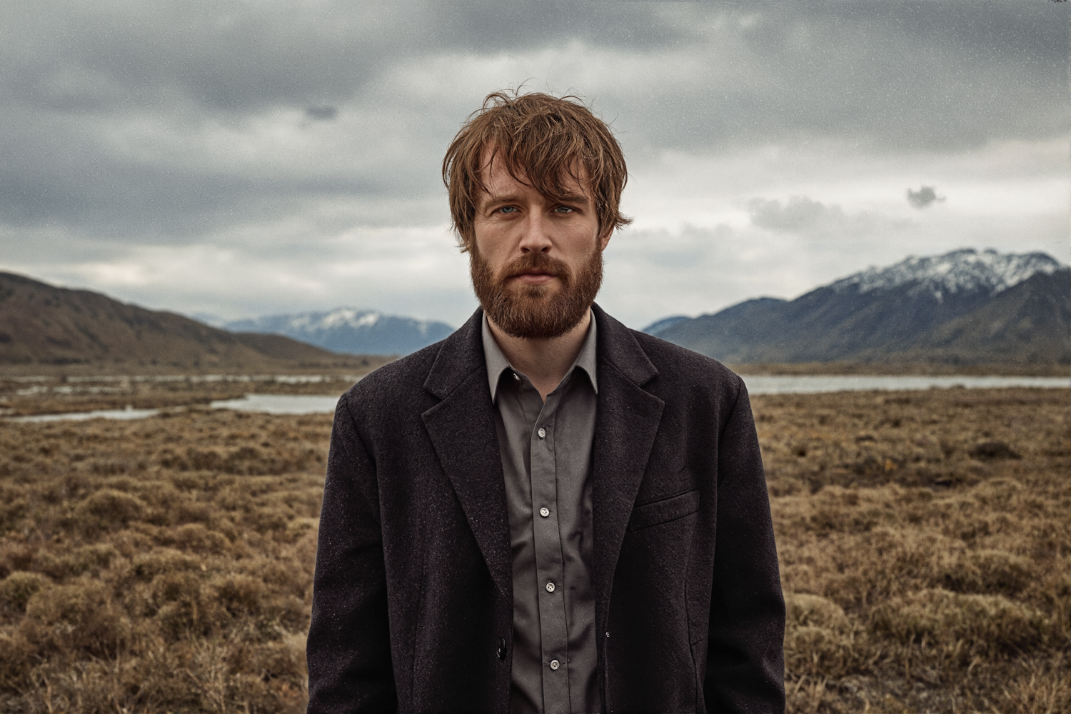 A bearded man in a dark blazer stands in a rugged landscape with mountains and cloudy skies, exuding a contemplative mood.
