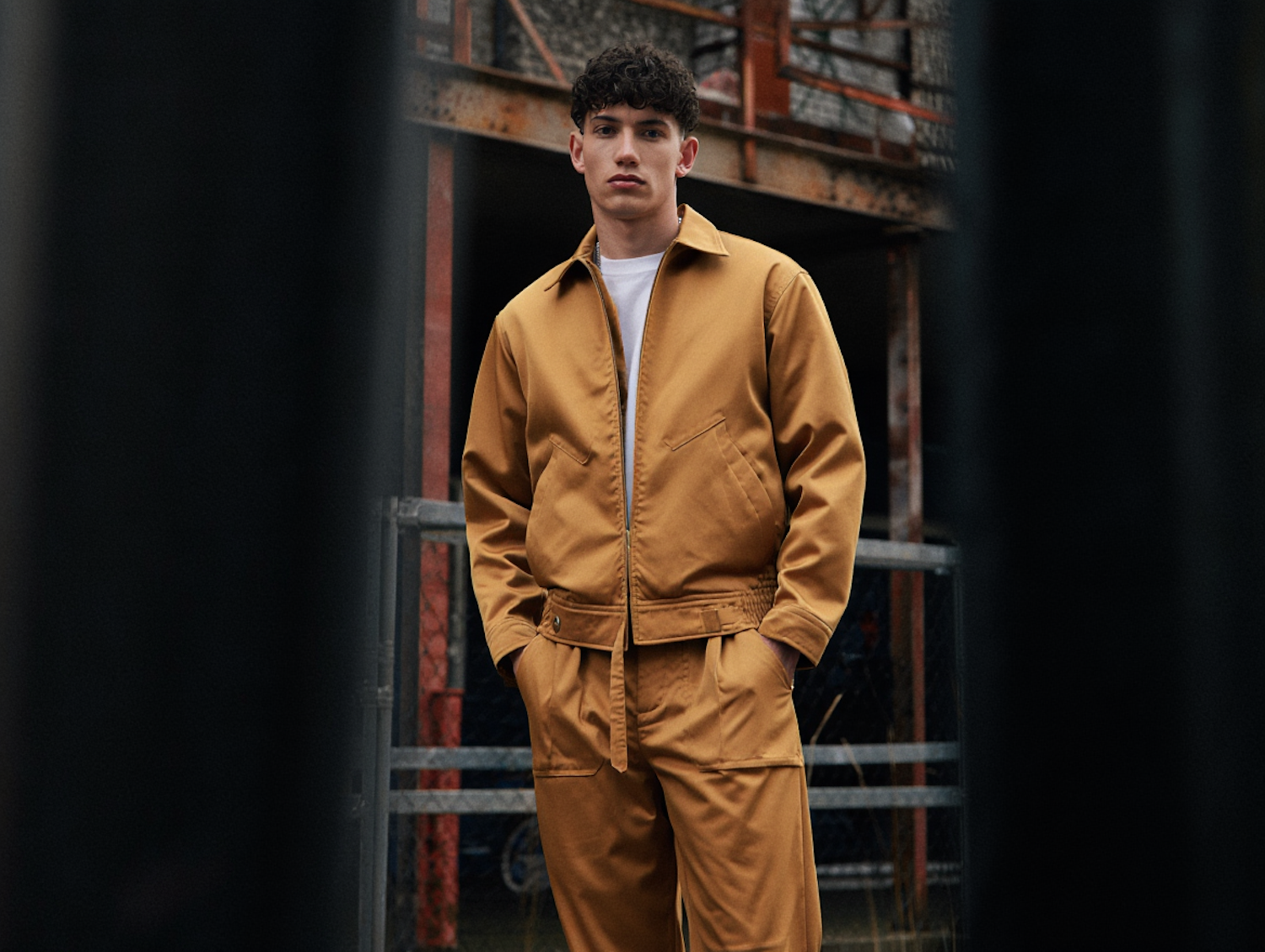 A young man in a mustard outfit stands confidently with a rugged industrial backdrop, accentuating the attire's bold color.