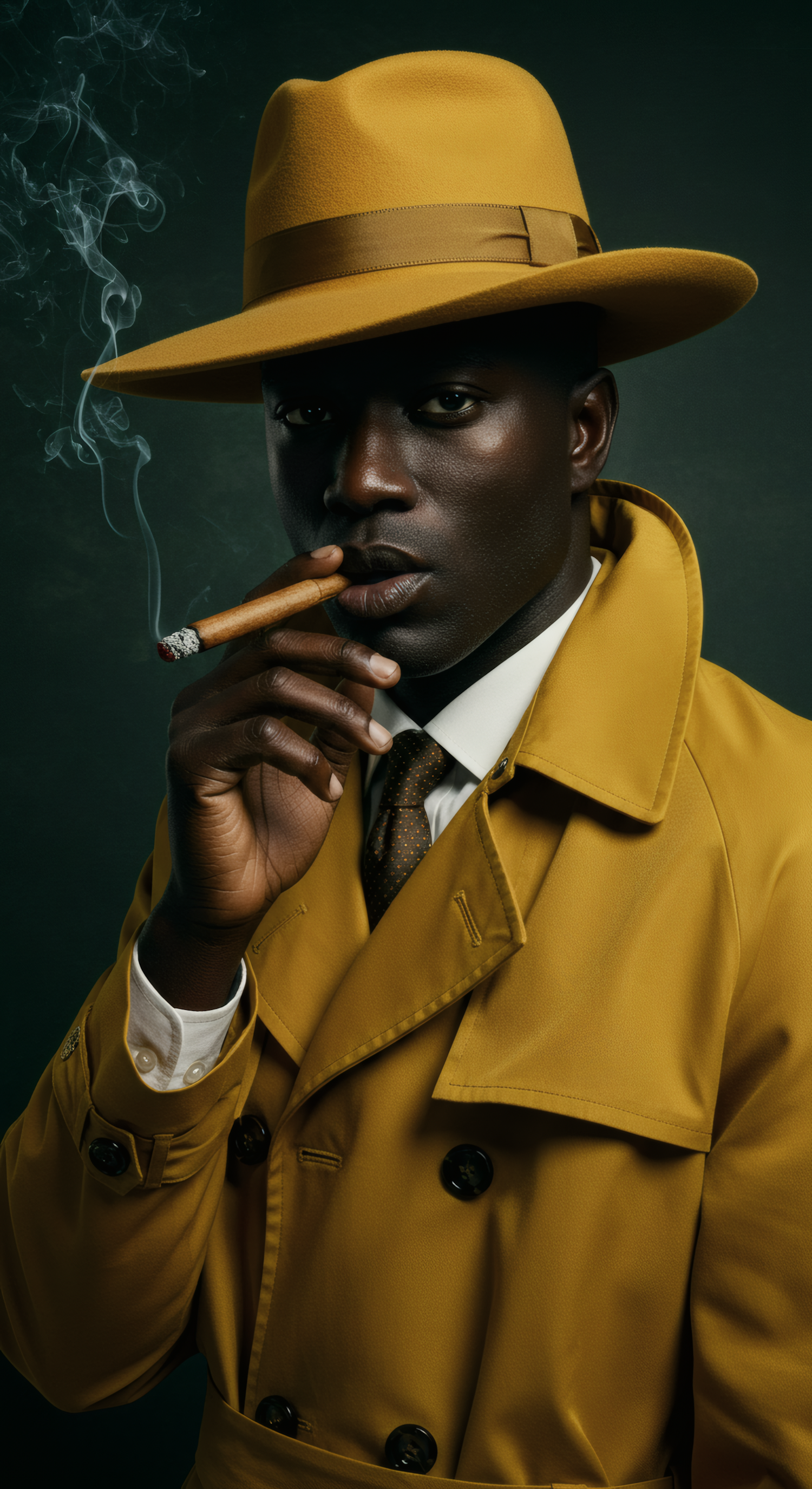 Stylish man in a yellow trench coat and fedora, smoking a cigar with dramatic lighting and a dark green background.