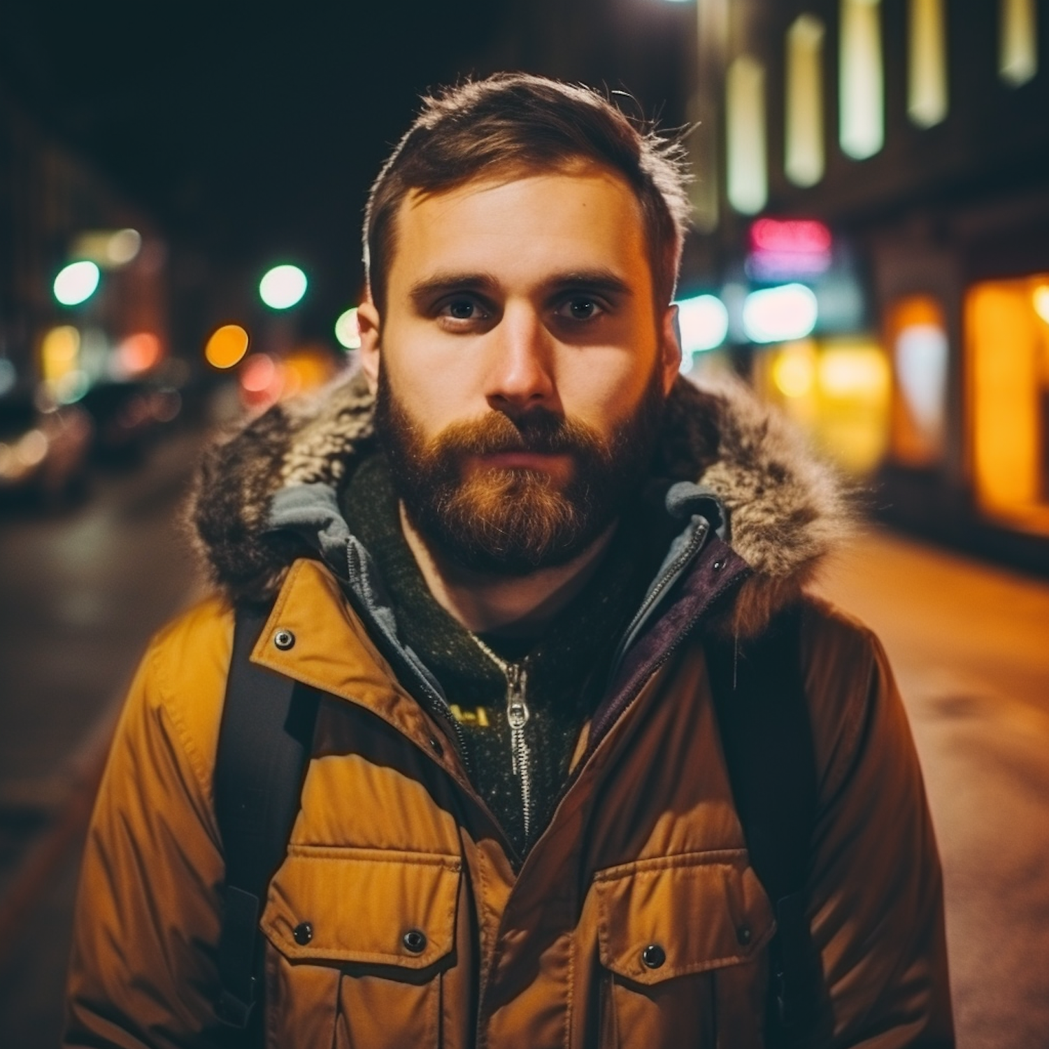 Caucasian man with a beard in a brown parka on a dimly lit street at night, with colorful bokeh lights in the background.