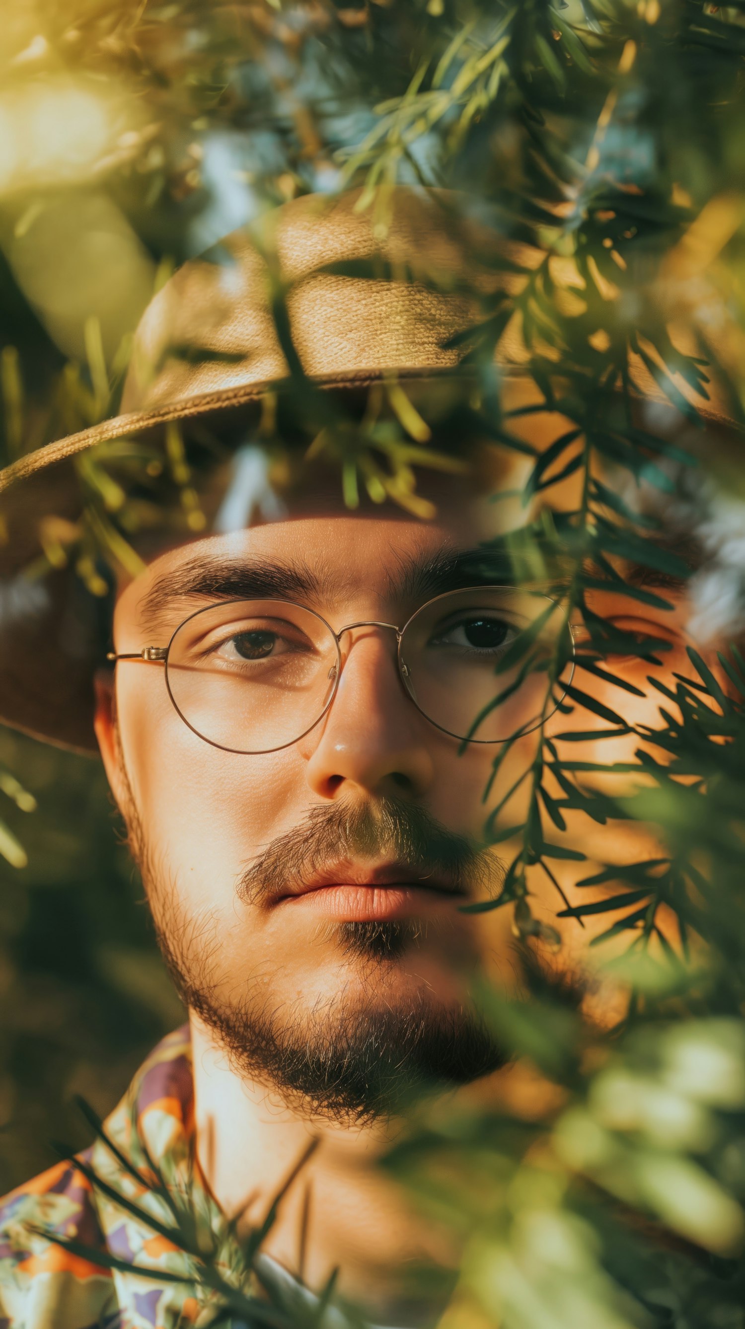 A young man with glasses and a straw hat peers through lush green foliage, bathed in warm sunlight.