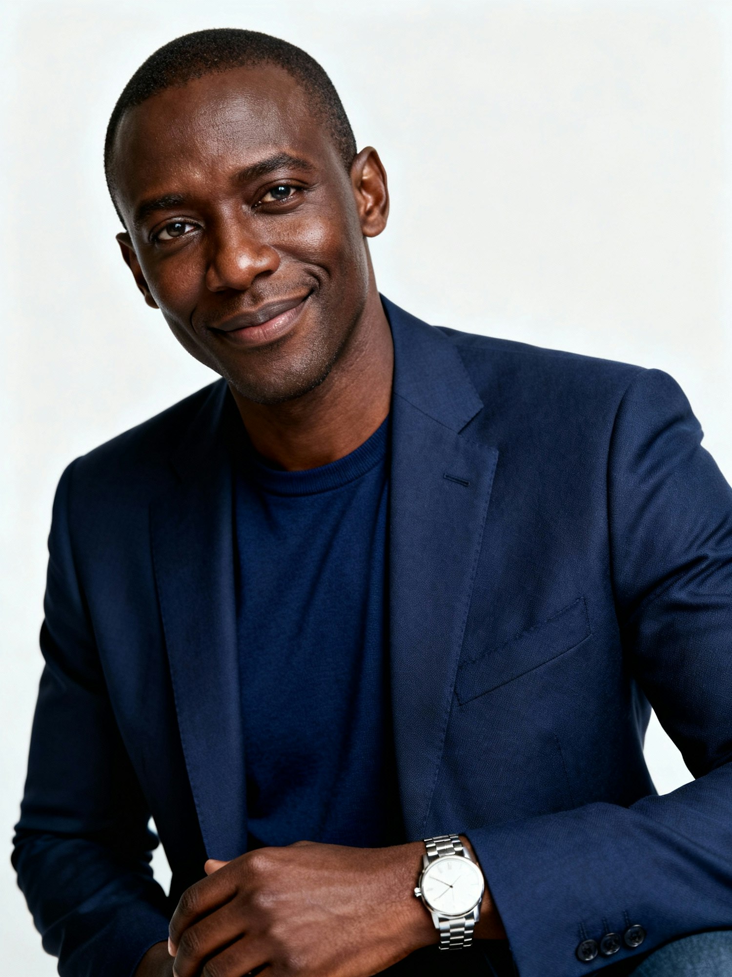 Studio portrait of a Kenyan man venture capital partner, 36; deep brown skin (cool-neutral); close-cropped hair; midnight blazer over navy crew; understated steel watch. Same white seamless + high-key soft Rembrandt + 105 mm. Expression: composed, assessing half-smile. Negative: wealth clichés, harsh contrast, skin plasticking.