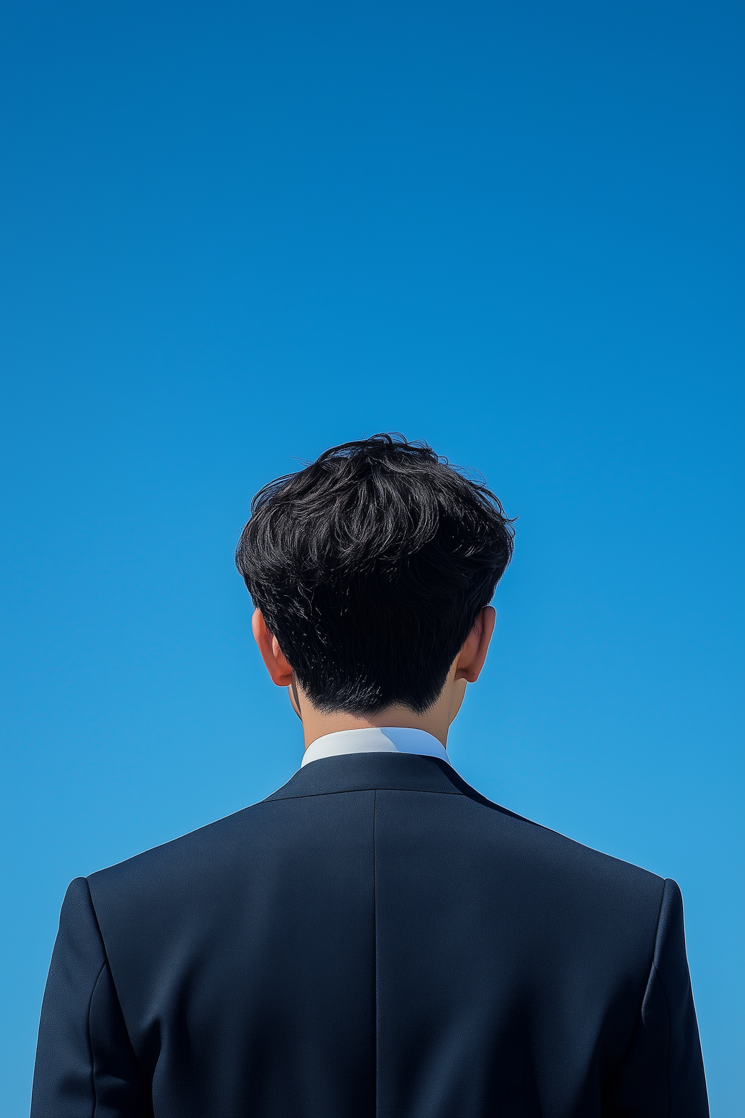 Man in a navy suit with wavy black hair stands against a vibrant blue sky, creating a clean and minimalistic aesthetic.