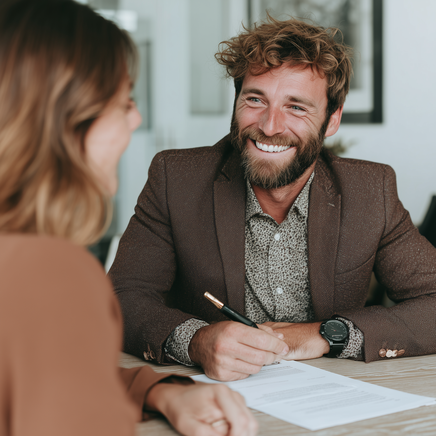 A cheerful man in a brown blazer and patterned shirt smiles while discussing a document in a bright office setting.