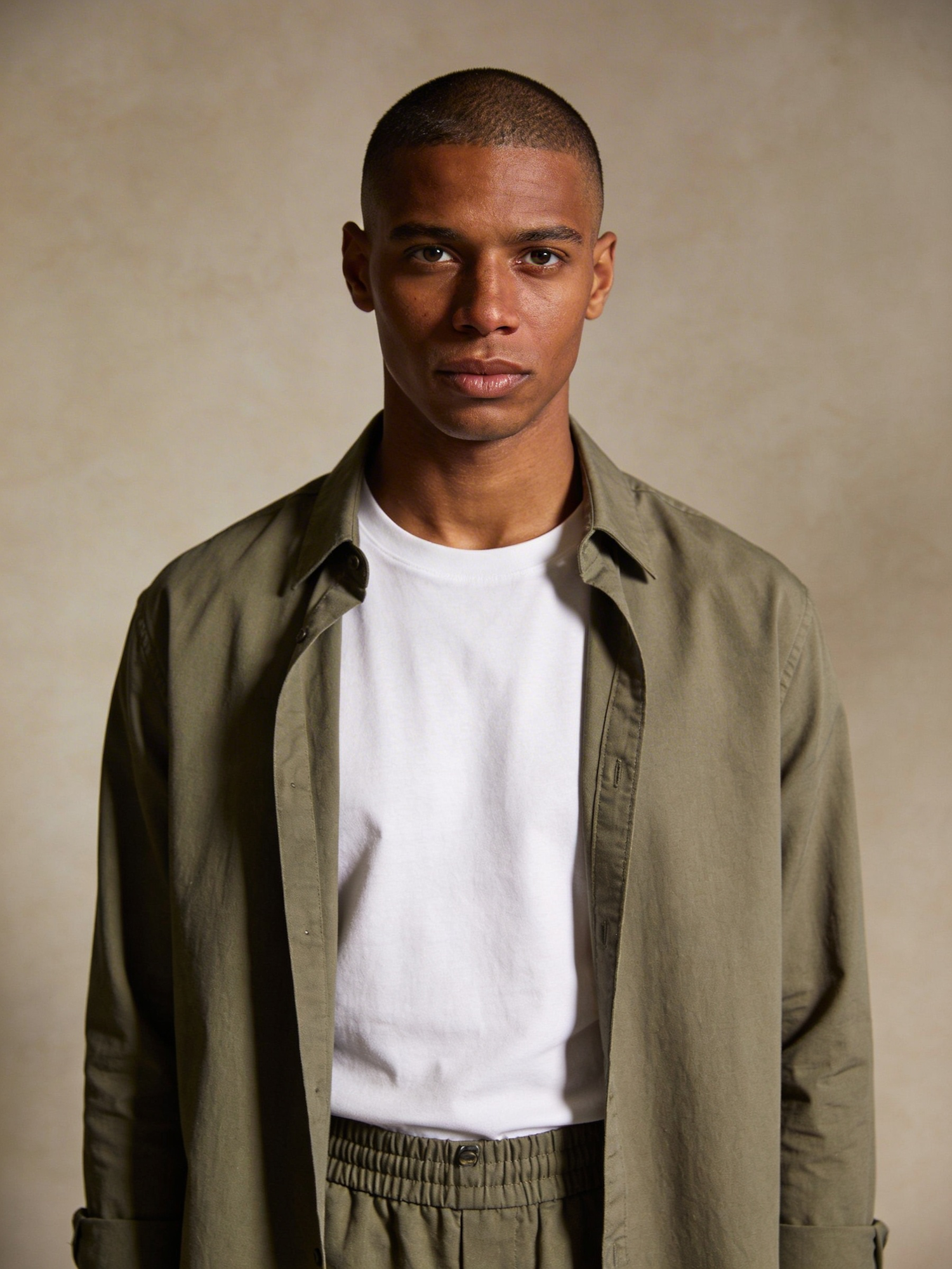Studio portrait, Scandi-minimal fashion editorial, male early 30s; deep brown skin with neutral undertone; close-cropped fade haircut, clean-shaven. Outfit: muted sage overshirt worn open over white tee, matching sage trousers (waistline visible), no logos. Framing: chest-up; straight-on. Solid muted stone-beige seamless backdrop. Rembrandt lighting with soft fill; 105 mm macro-sharp. Expression: composed, calm authority, direct gaze.