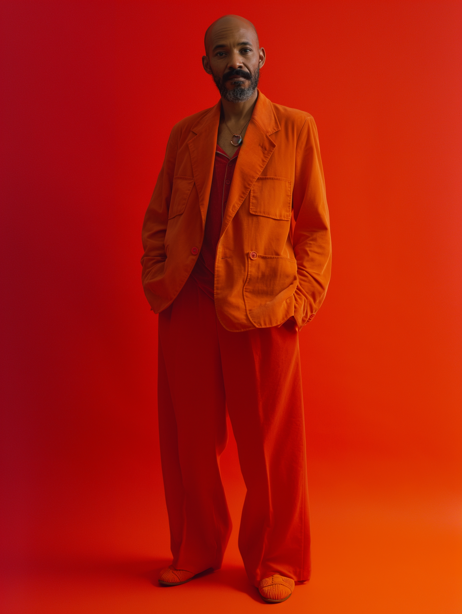 A man in an orange suit stands against a vivid red background, exuding confidence and style.