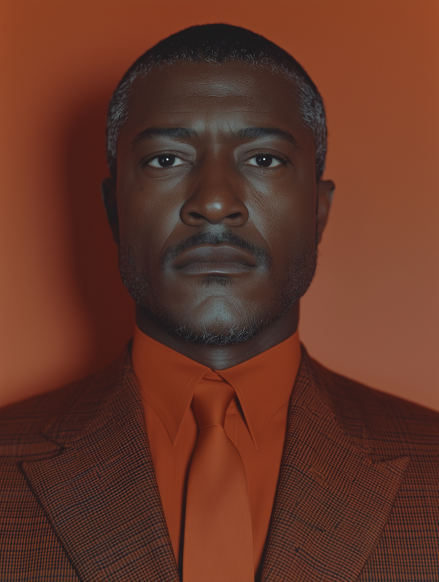 Portrait of a middle-aged Black man in an orange suit against an orange background, exuding elegance and intensity.