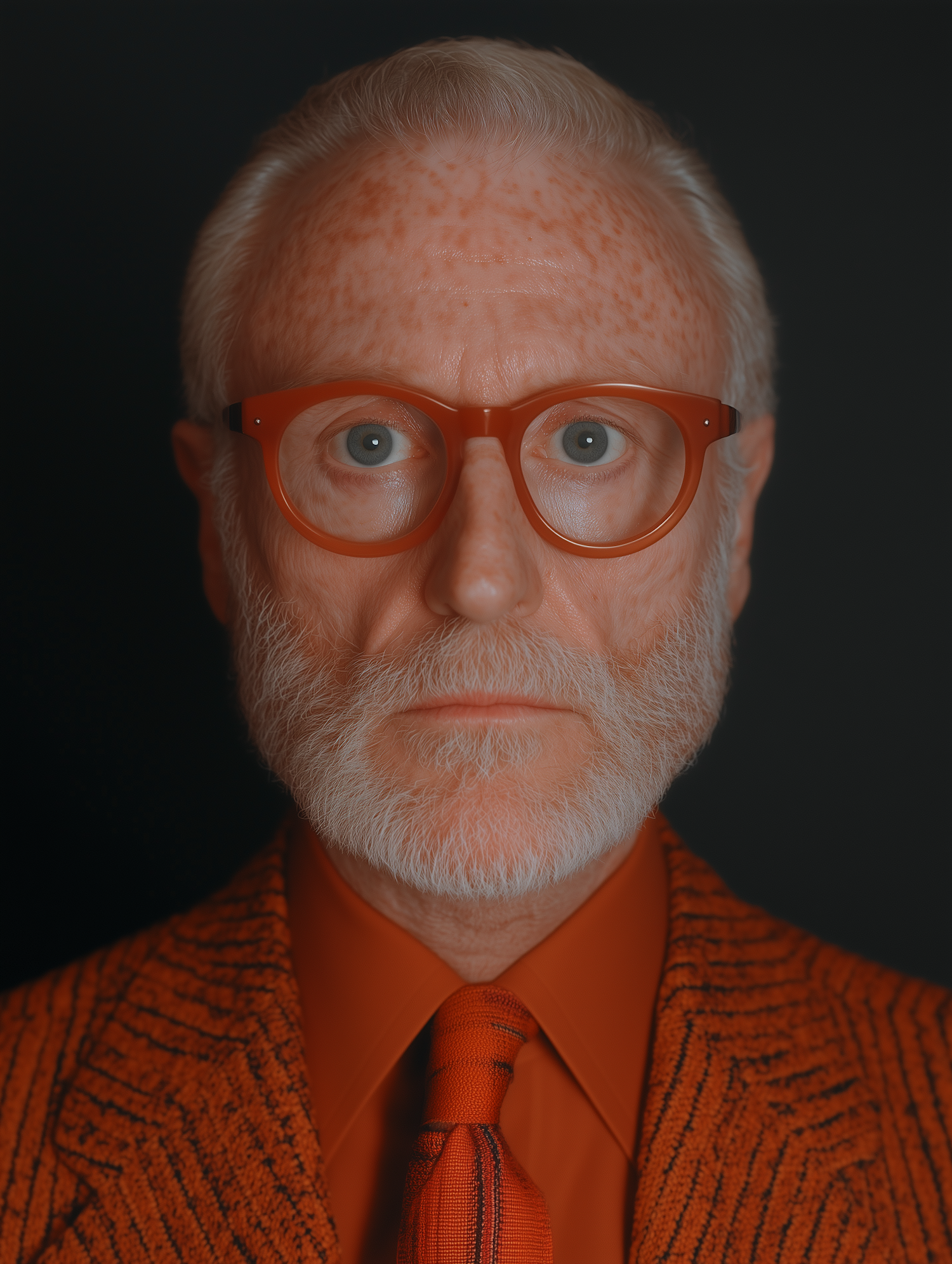 Caucasian man with white beard and orange glasses in a vibrant orange suit, staring intensely at the camera against a dark background.