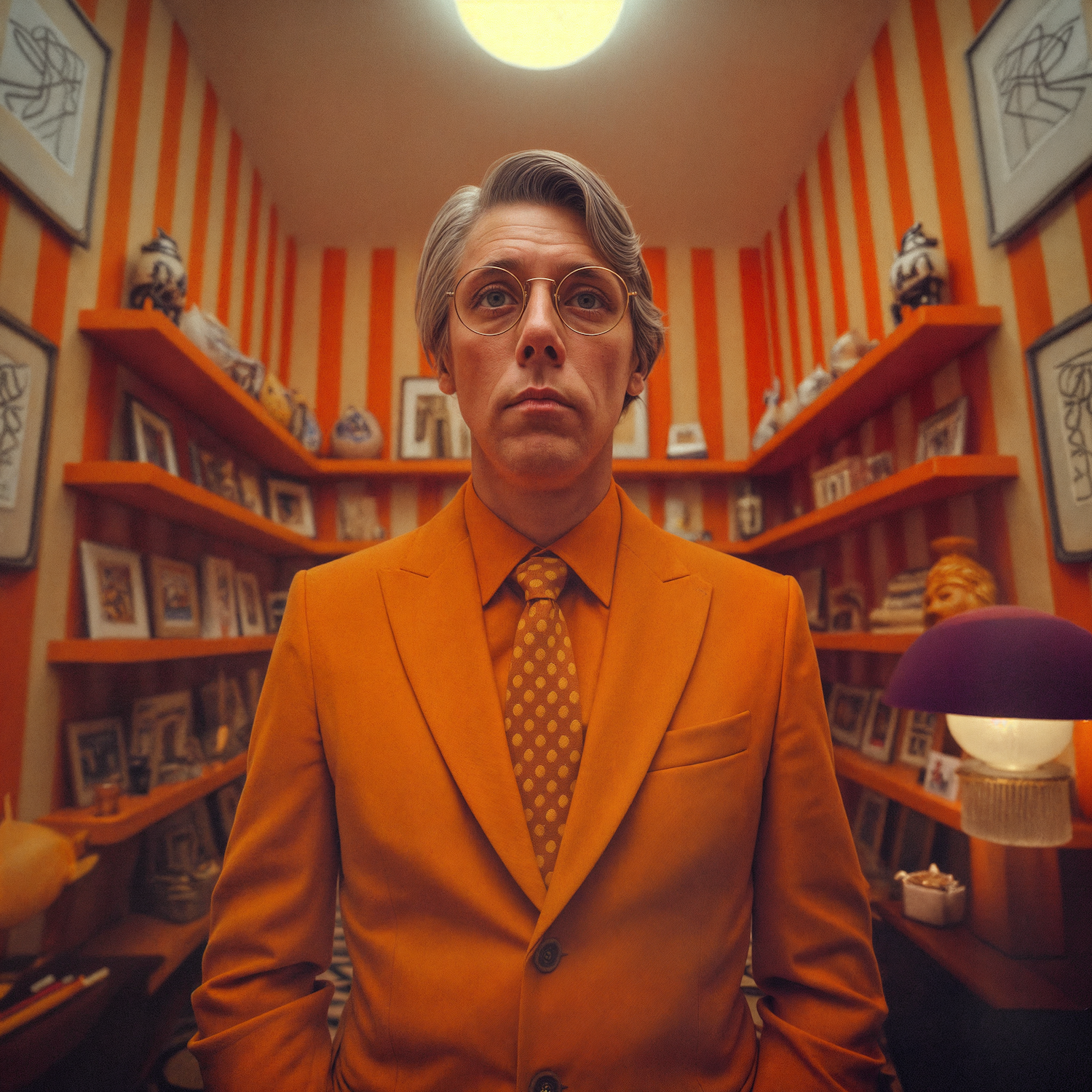 Man in orange suit with retro glasses in a striped room filled with art and decor, exuding a vintage and artistic vibe.