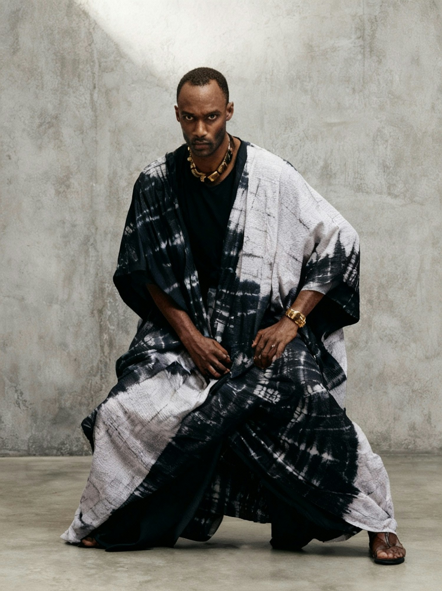 A man in a striking tie-dye outfit poses against a textured background, accessorized with bold jewelry, creating a captivating visual.