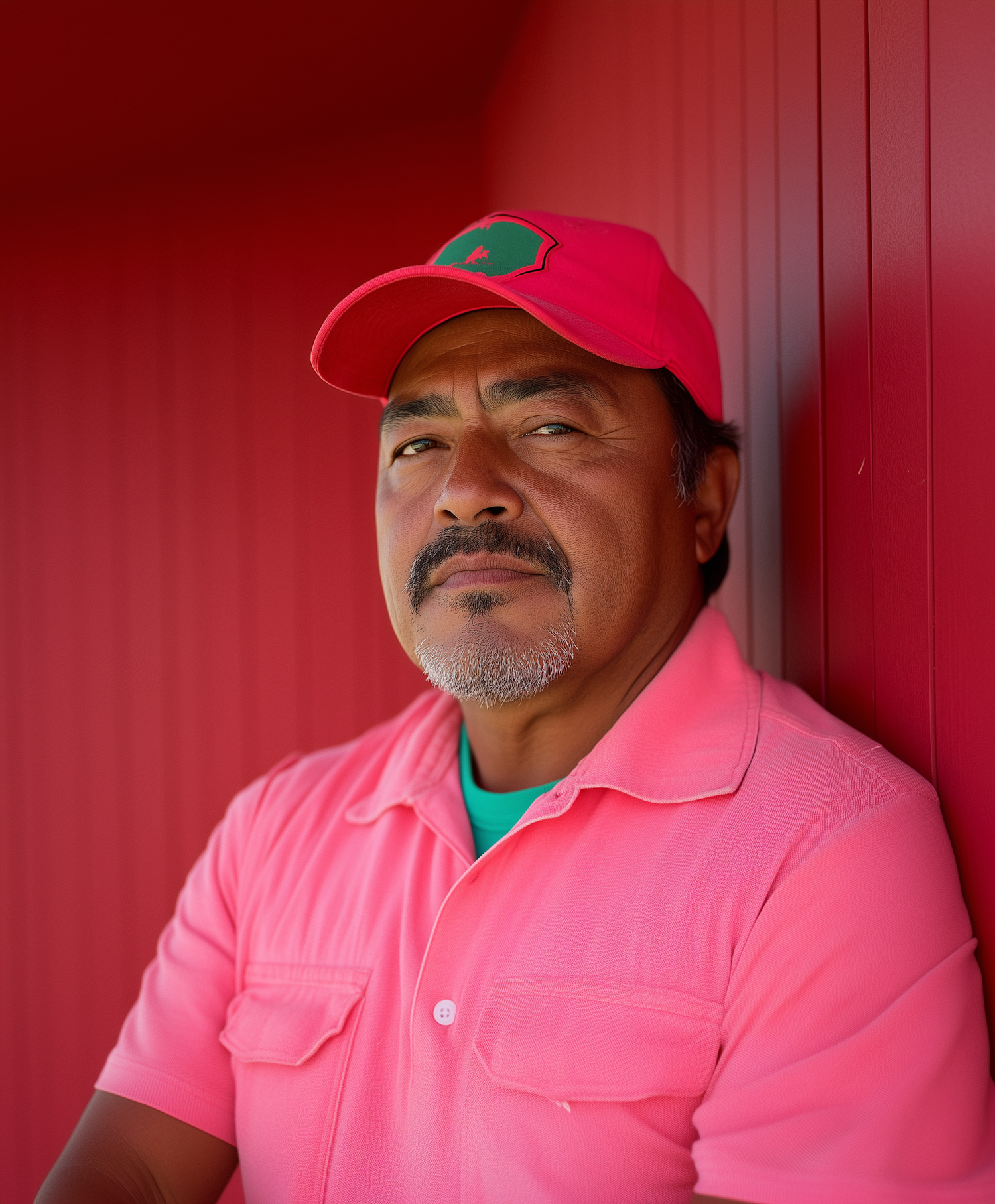 Middle-aged Hispanic man in pink shirt and cap against a red wall, exuding confidence and style.