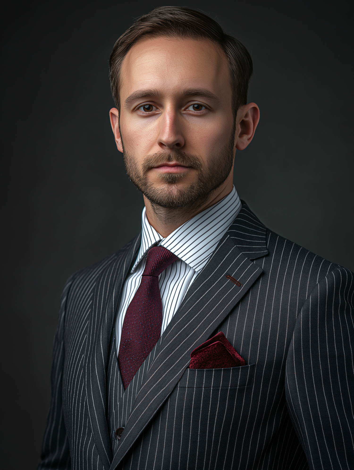 Elegant portrait of a man in a pinstripe suit with a burgundy tie and pocket square, exuding sophistication and style.
