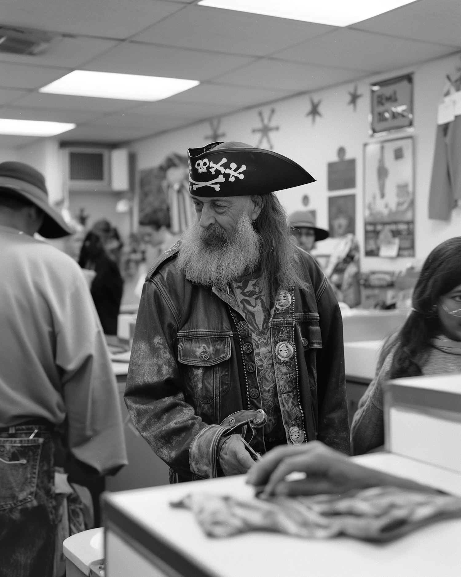A bearded man in a pirate hat and denim jacket stands in a store, holding a sword. Black and white photo with a whimsical theme.