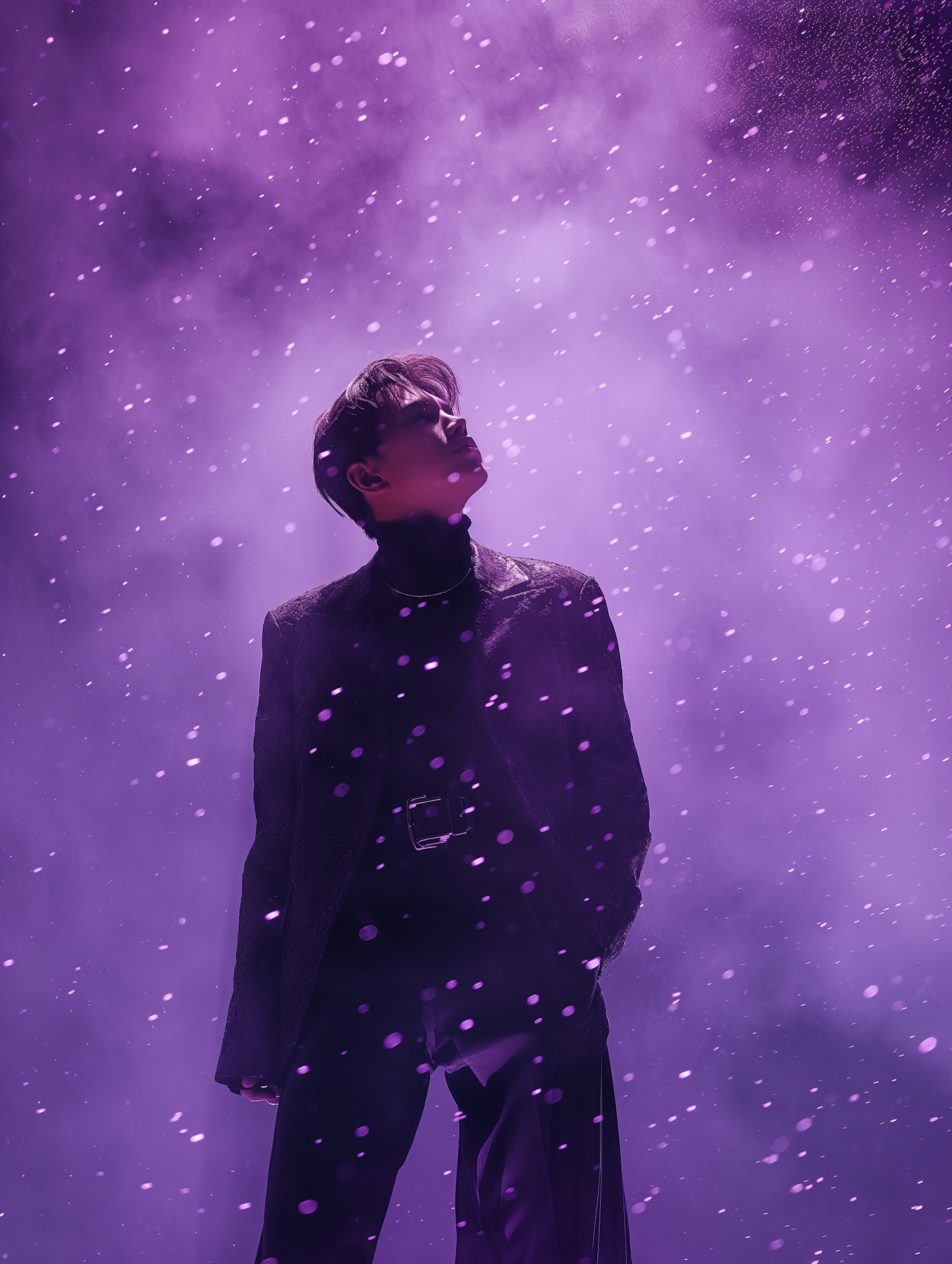 A person in a dark outfit stands in a purple mist, gazing upward, surrounded by floating particles, creating a dreamy atmosphere.