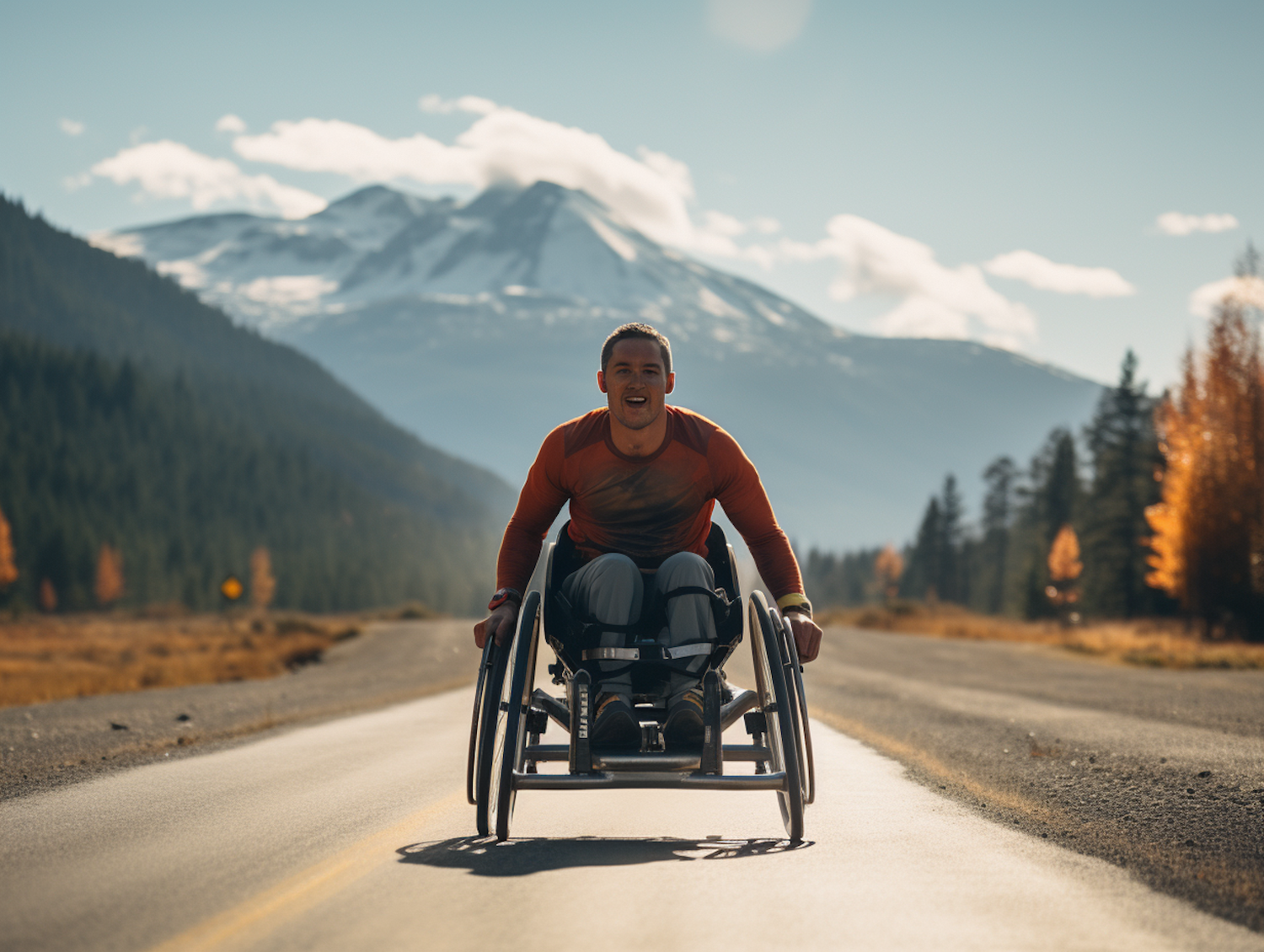 Man in wheelchair on scenic road with mountains and autumn trees, exuding determination and joy under a clear blue sky.