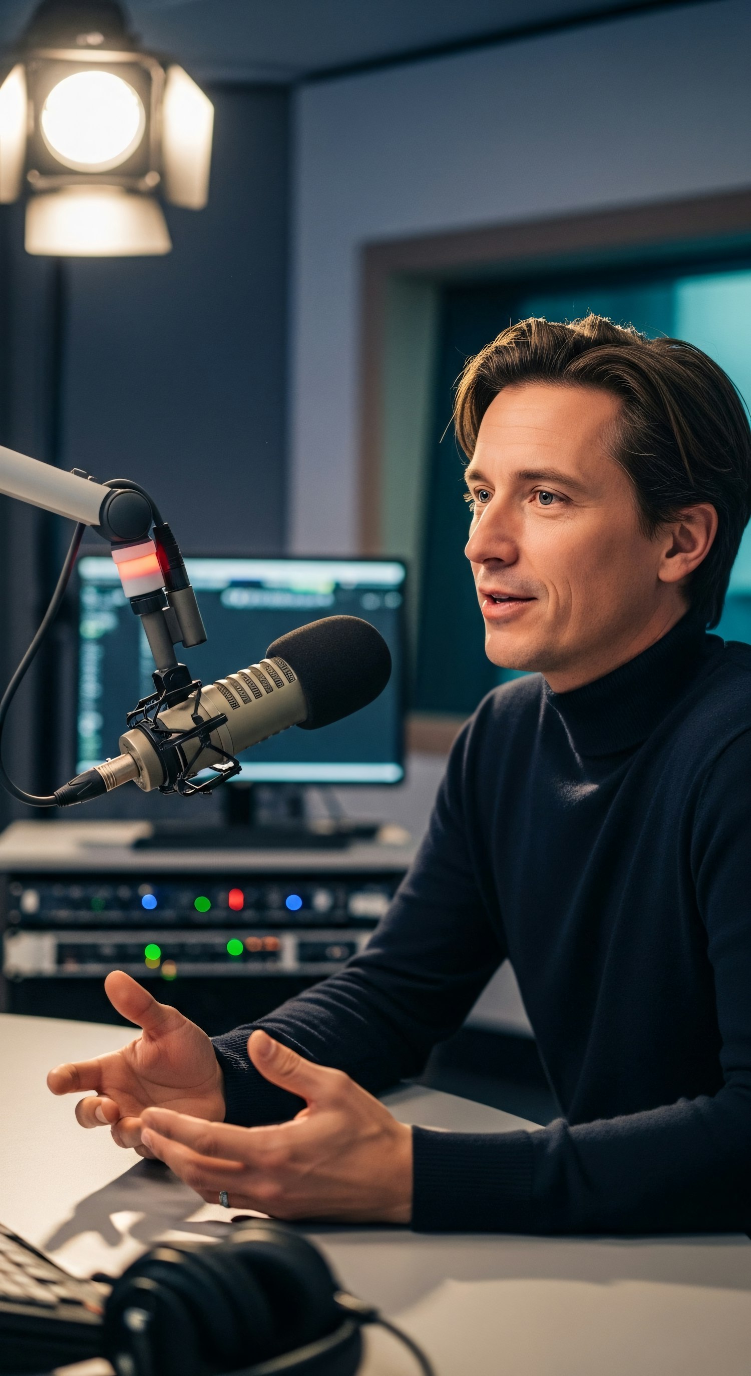Man in a recording studio speaking into a microphone, wearing a dark sweater, with studio equipment in the background.