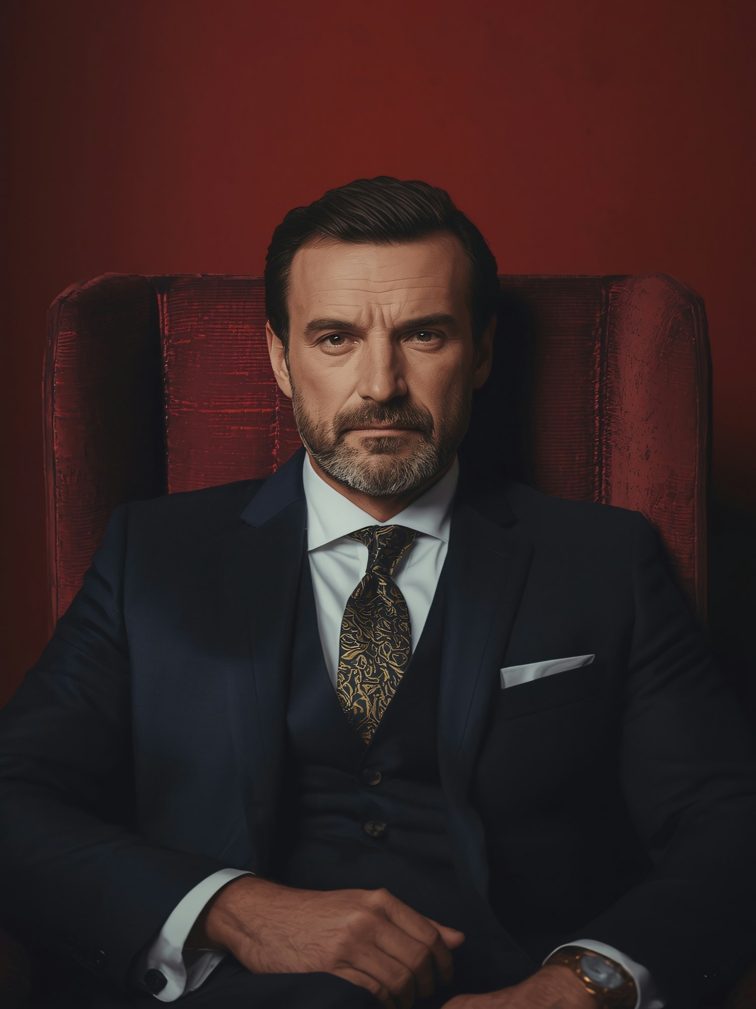 A man in a navy suit with a patterned tie sits in a red armchair, exuding confidence and professionalism against a red background.