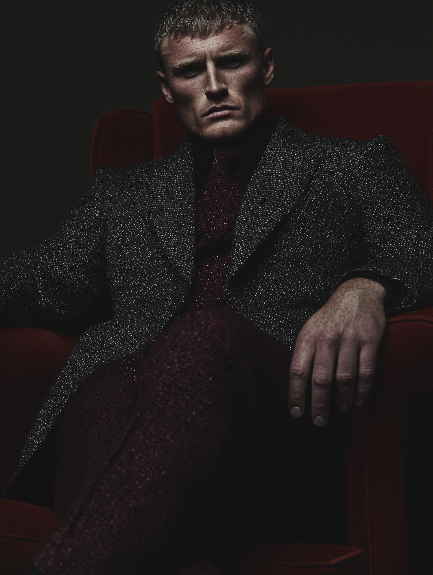 Caucasian man in a textured gray suit sits in a red velvet chair, exuding intensity and style against a dark background.