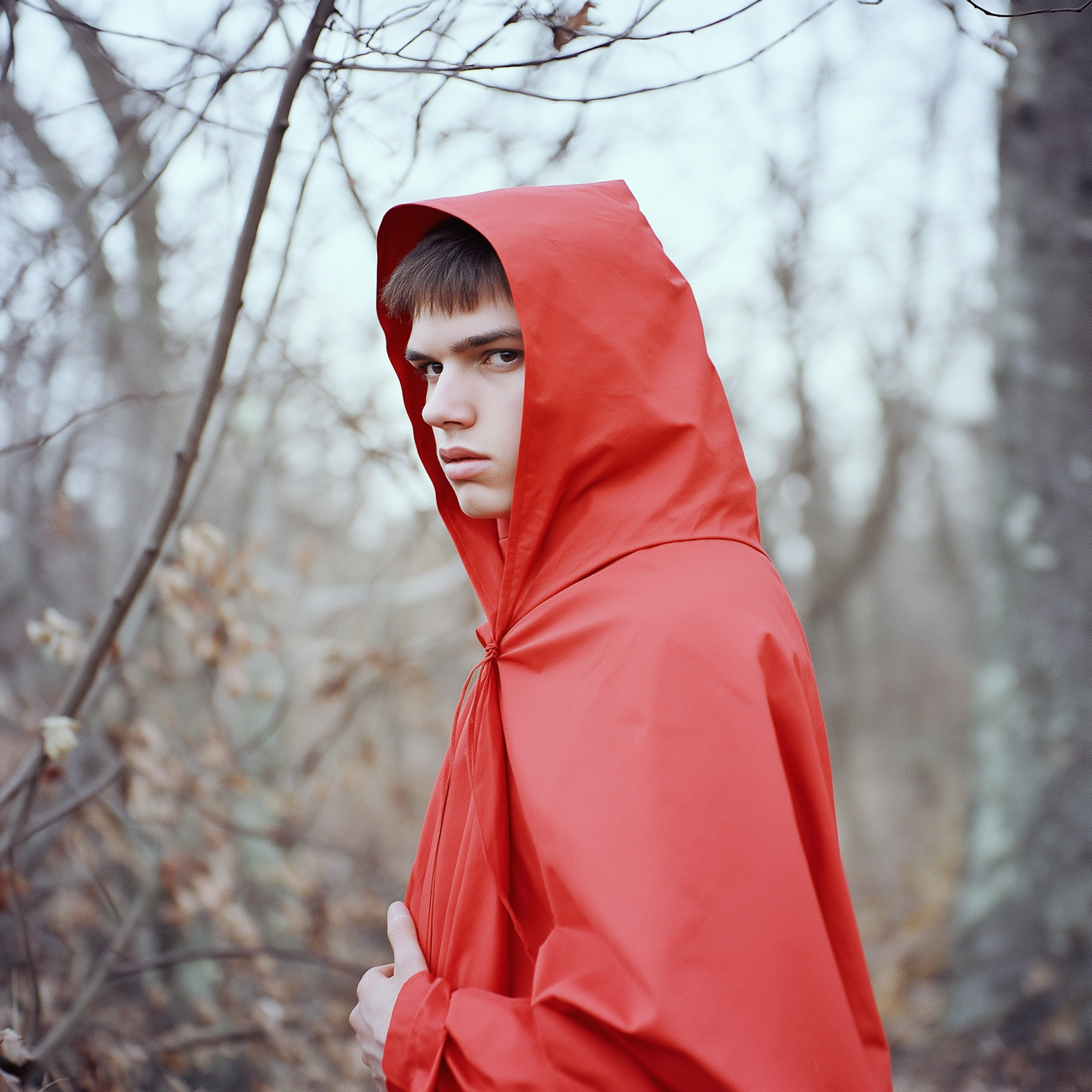 A young man in a red hooded cloak stands in a bare forest, his intense gaze and the vibrant red contrasting with the muted surroundings.