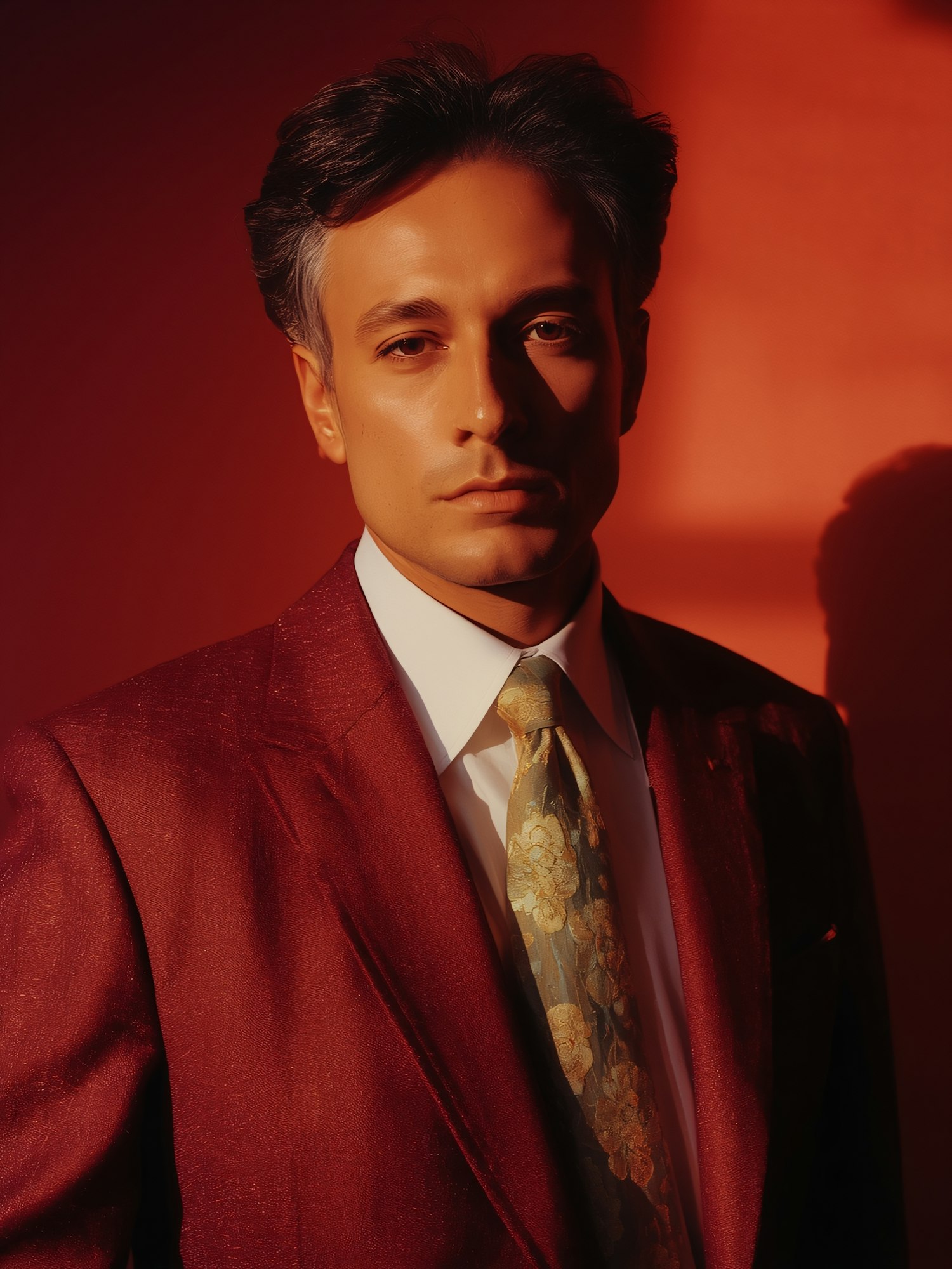 A man in a red suit and patterned tie stands against a red background, illuminated by warm lighting.