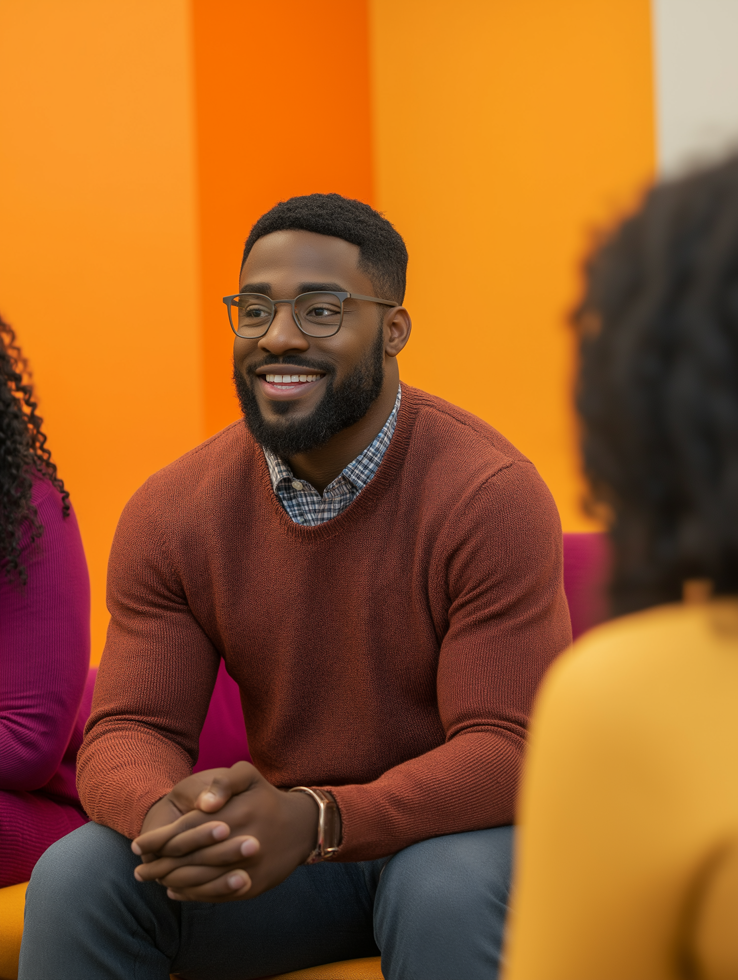 Smiling man in a rust sweater and glasses seated in a vibrant room, exuding warmth and friendliness in a group setting.