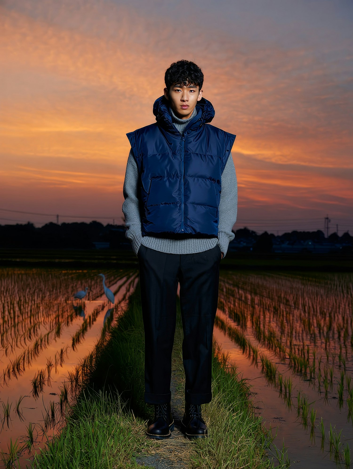Man in a navy puffer vest and gray sweater stands on a path by rice paddies at sunset, with warm orange skies and serene reflections.