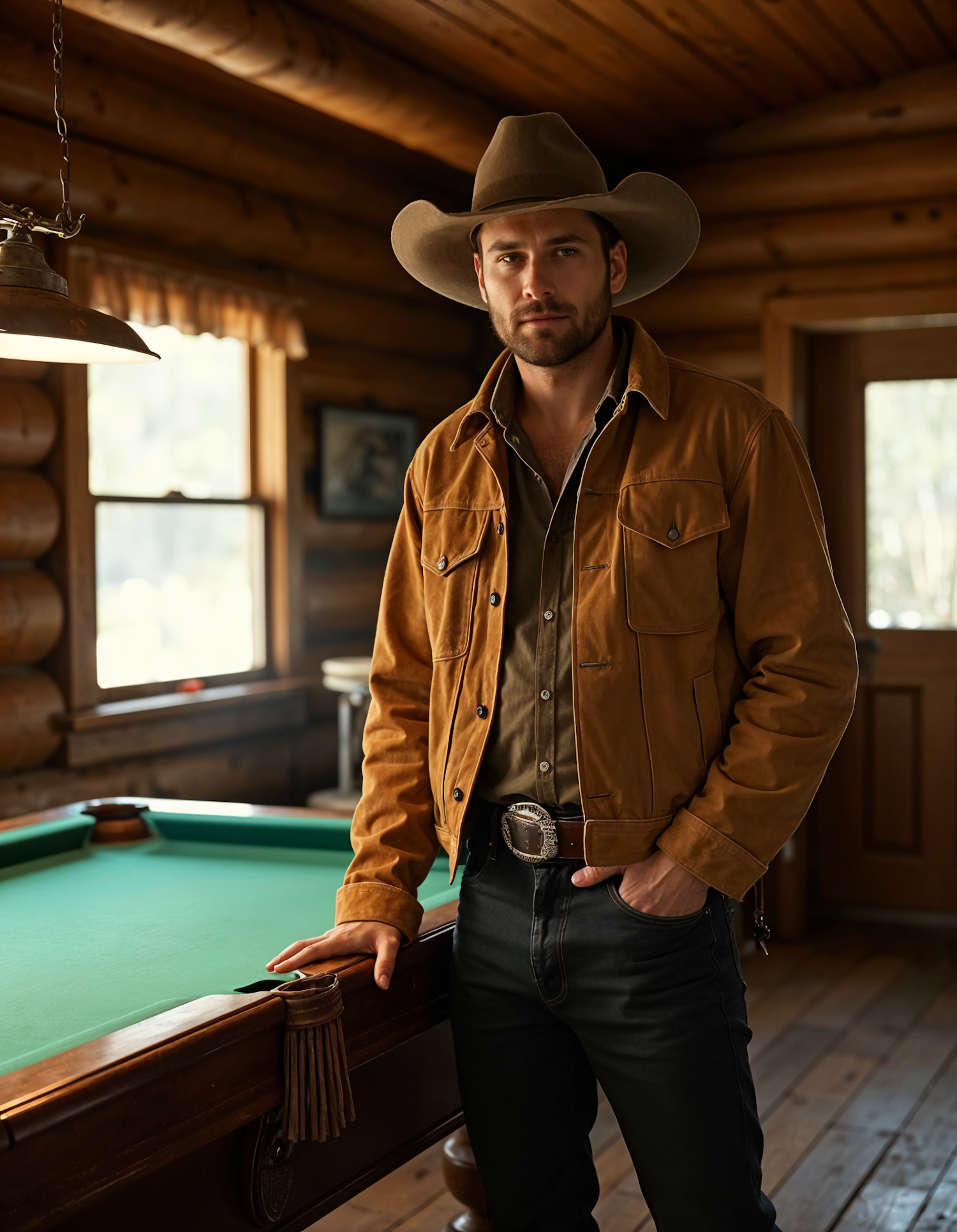 A rugged man in a cowboy hat and suede jacket leans on a pool table in a cozy log cabin with warm wooden interiors.