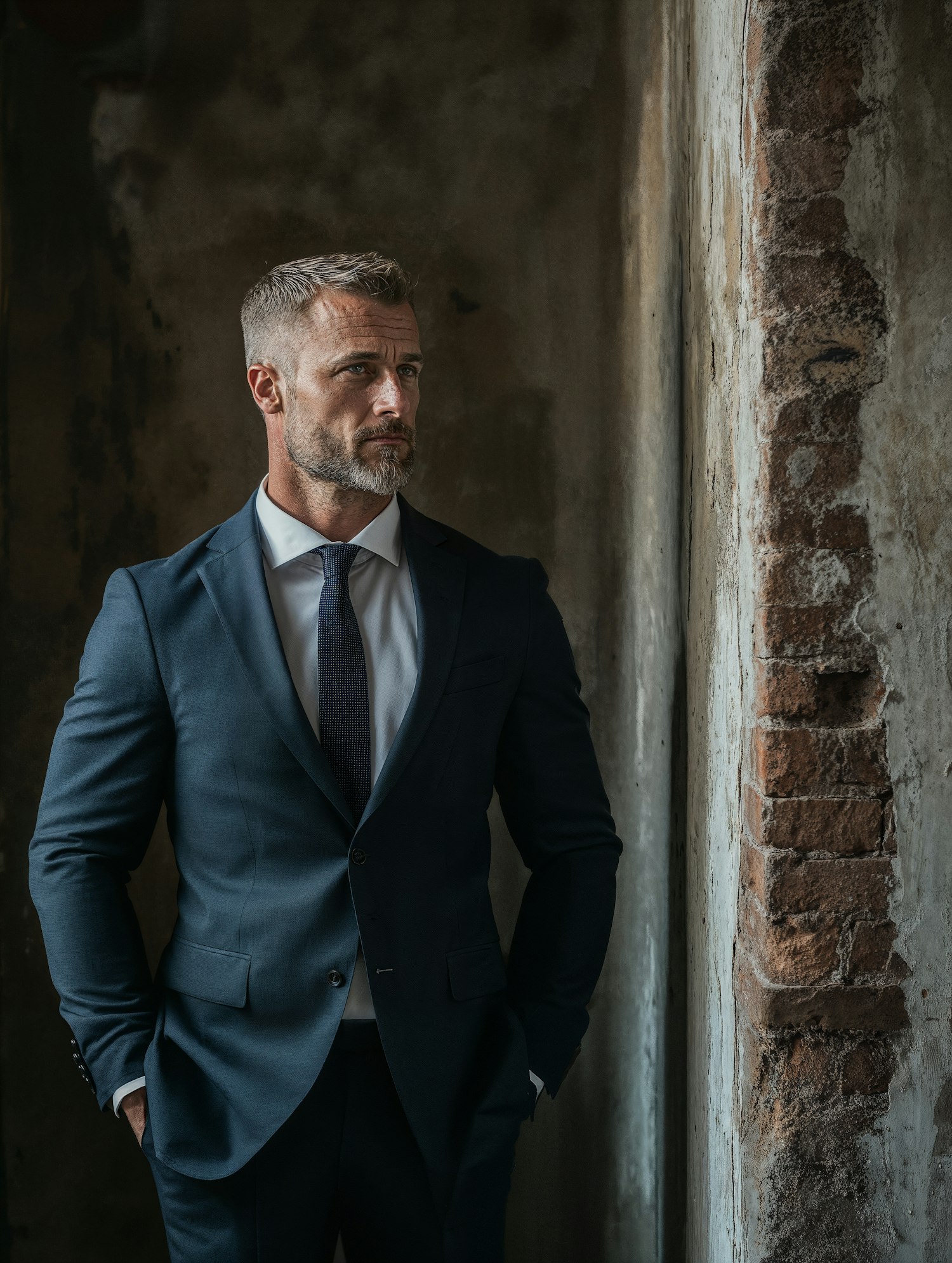 A man in a navy suit with gray hair and a beard stands in a rustic room with exposed brick, gazing thoughtfully to the side.