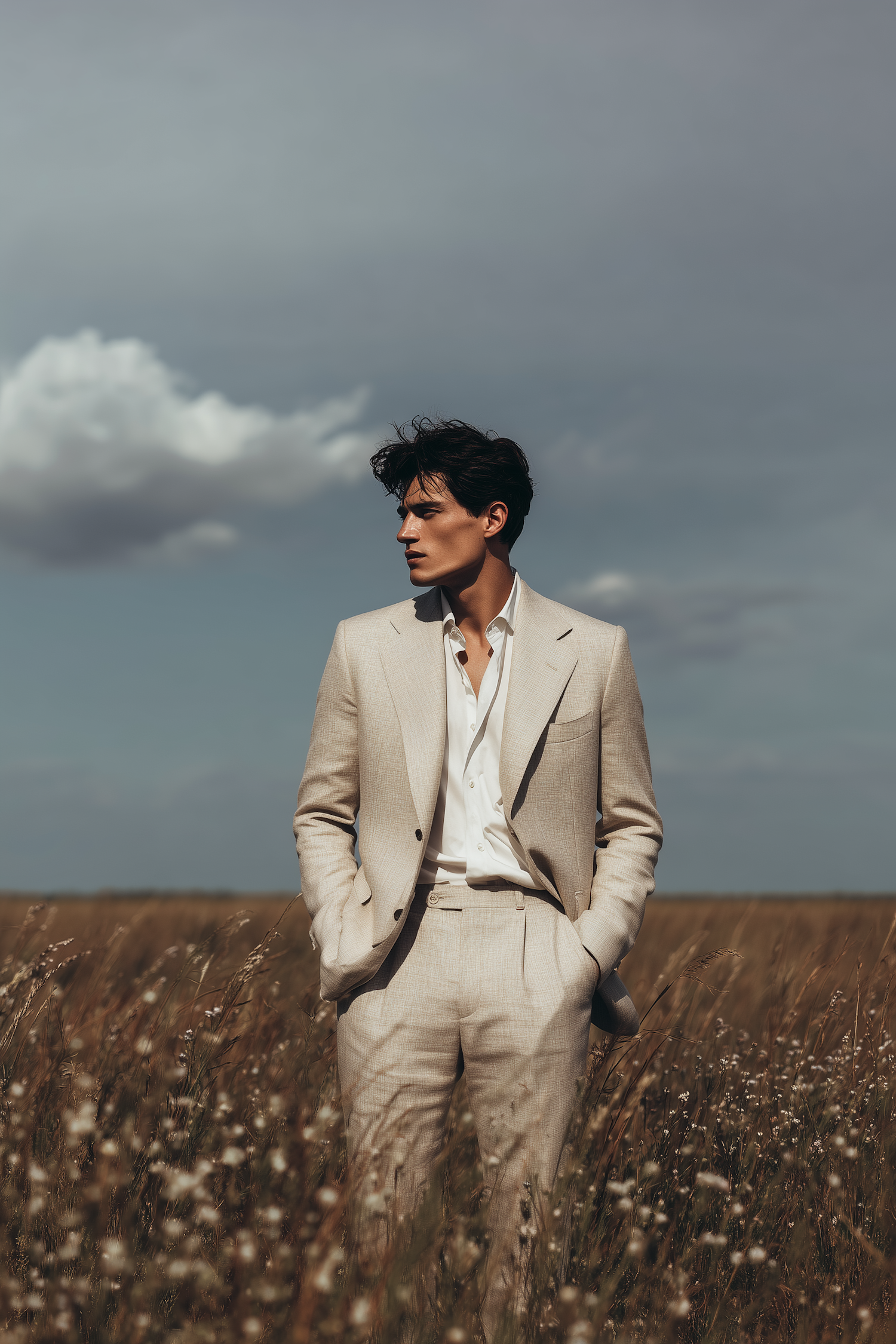 A man in a beige suit stands in a grassy field under a cloudy sky, exuding a calm and stylish presence.