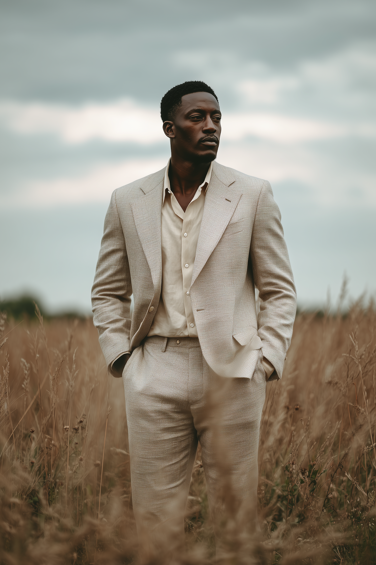 A man in a beige suit stands in a grassy field under a cloudy sky, exuding calm and elegance in a natural setting.