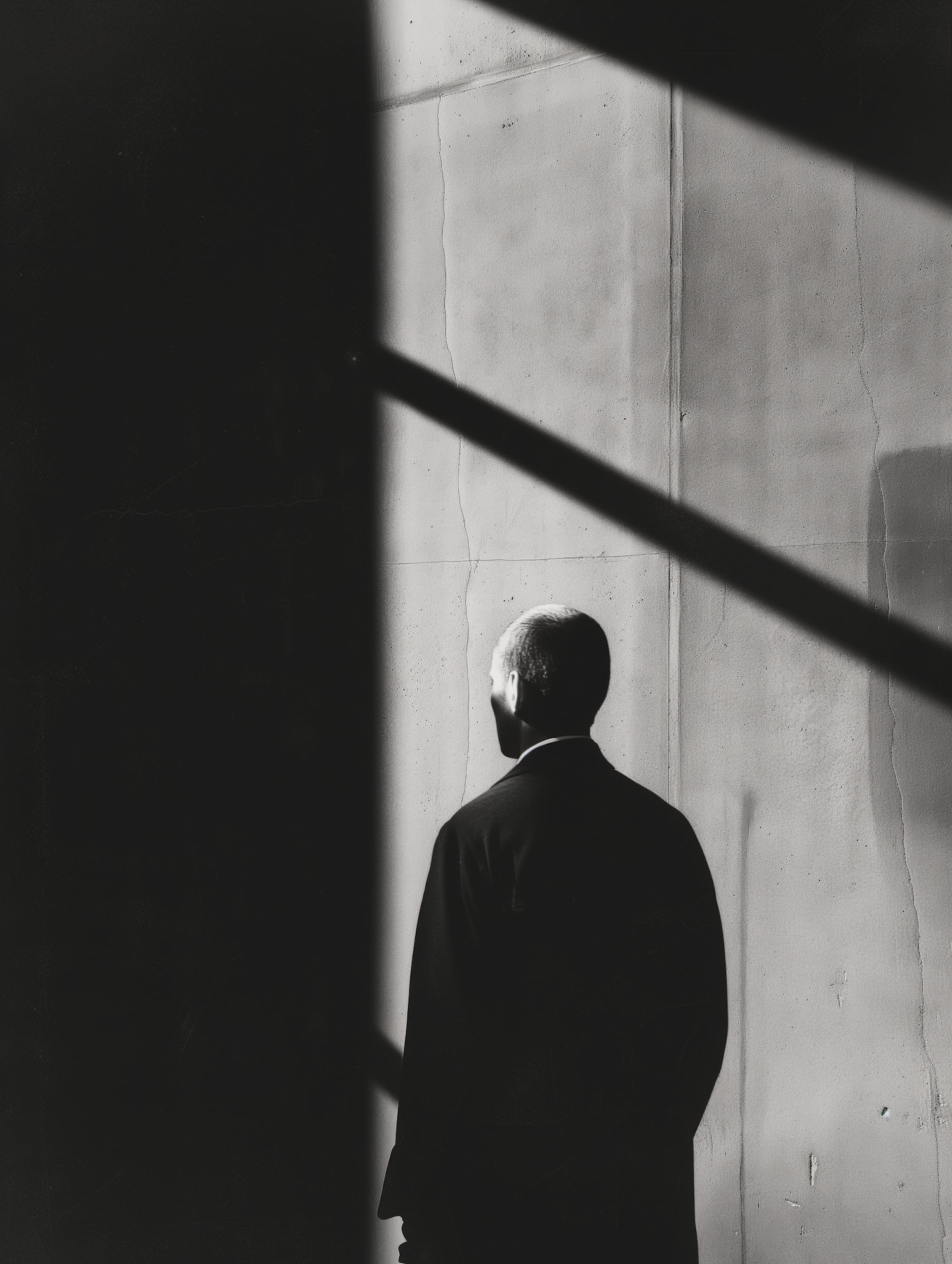Black and white photo of a man in a suit, standing in dramatic light and shadow, creating a contemplative mood.